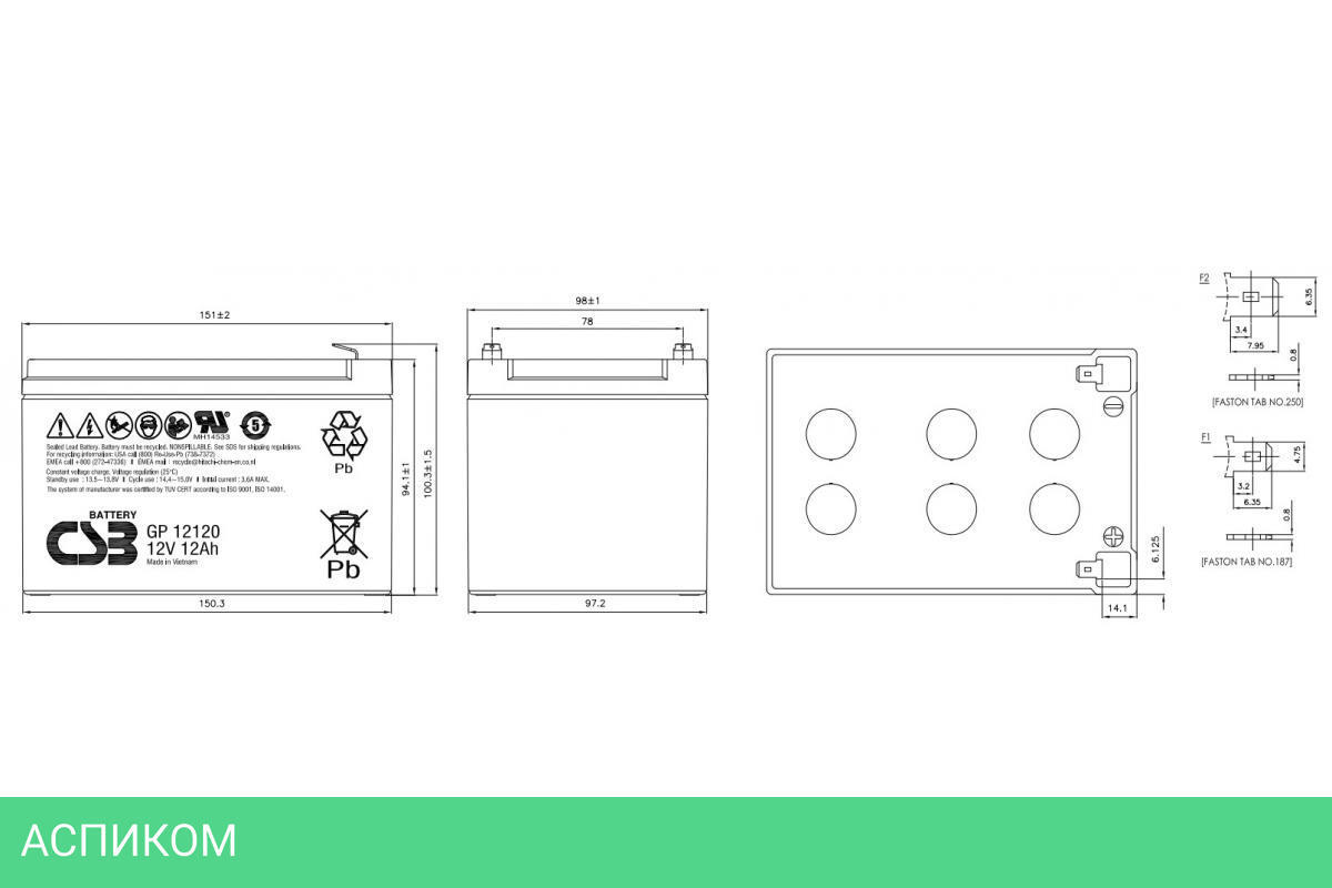 аккумулятор для ИБП / AGM / 12.0 / 150.0 / 12.0 / F1; F2 / 98.0 / 100.3 / 151.0 / 3.67
