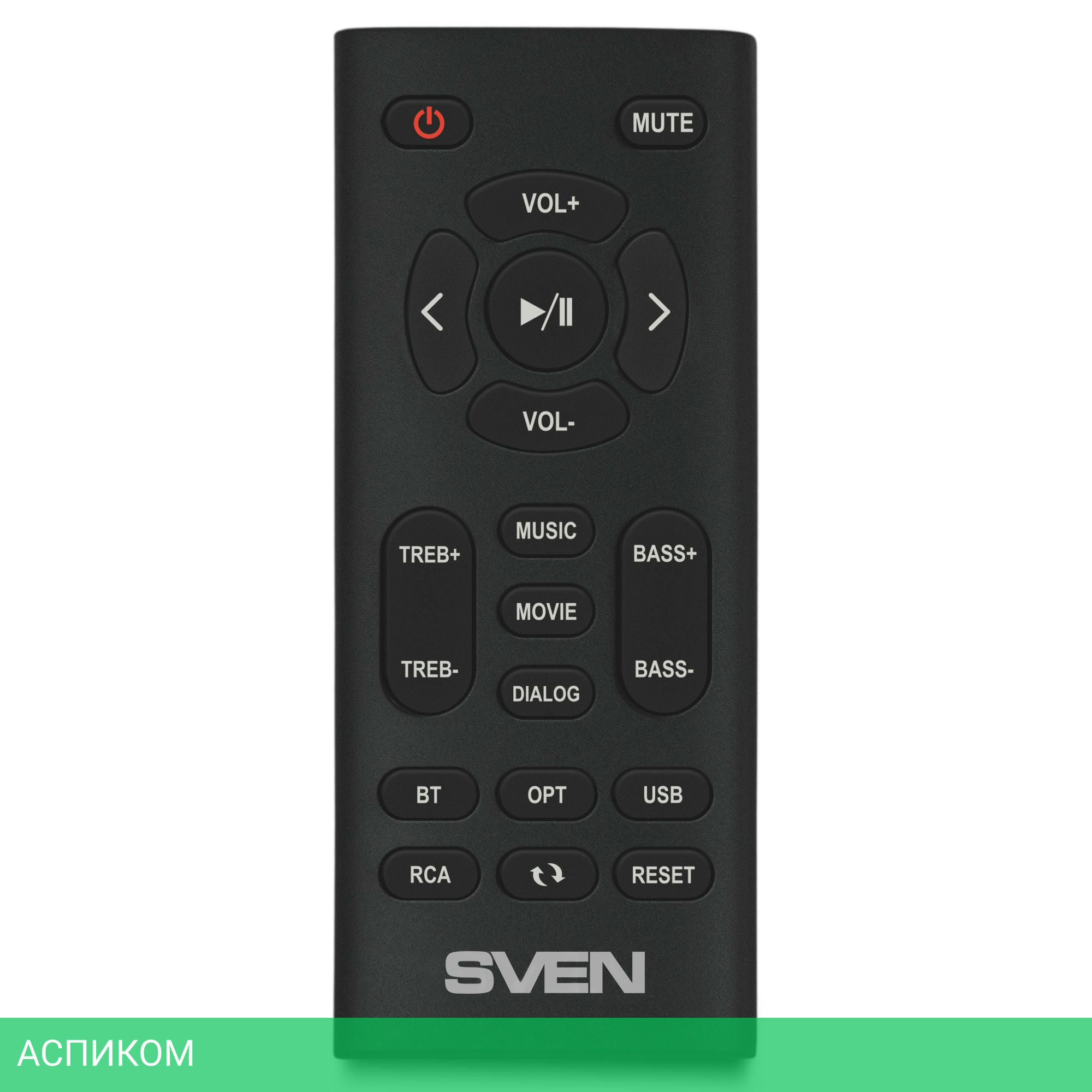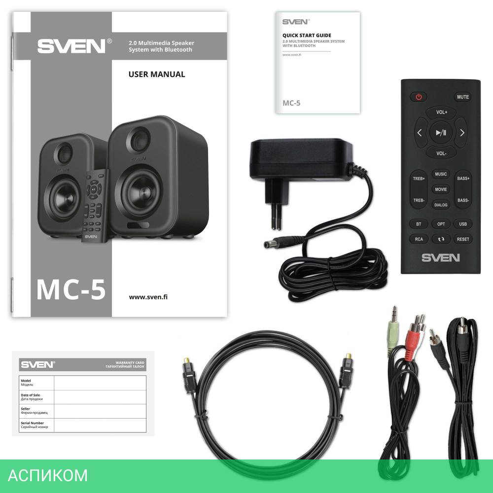 акустическая система, кабель RCA-RCA, кабель RCA-Jack 3,5 мм, кабель оптический, адаптер питания, пульт ДУ, документация, упаковка