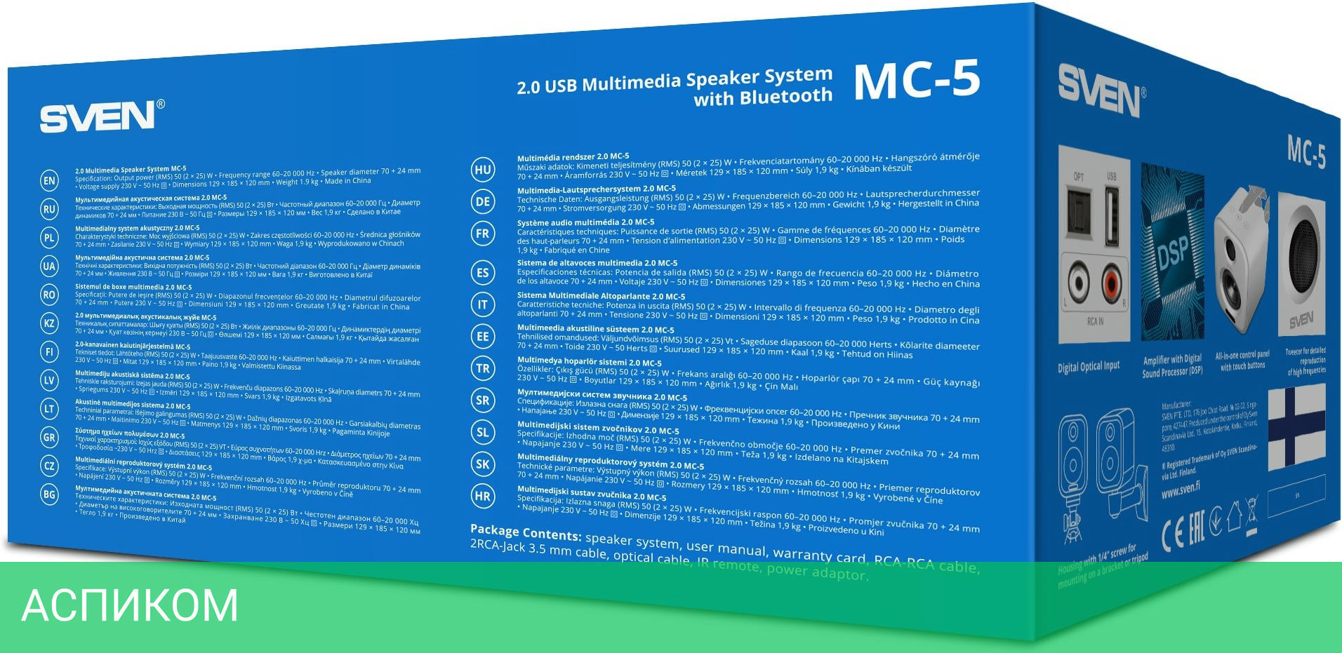 акустическая система, кабель RCA-RCA, кабель RCA-Jack 3,5 мм, кабель оптический, адаптер питания, пульт ДУ, документация, упаковка