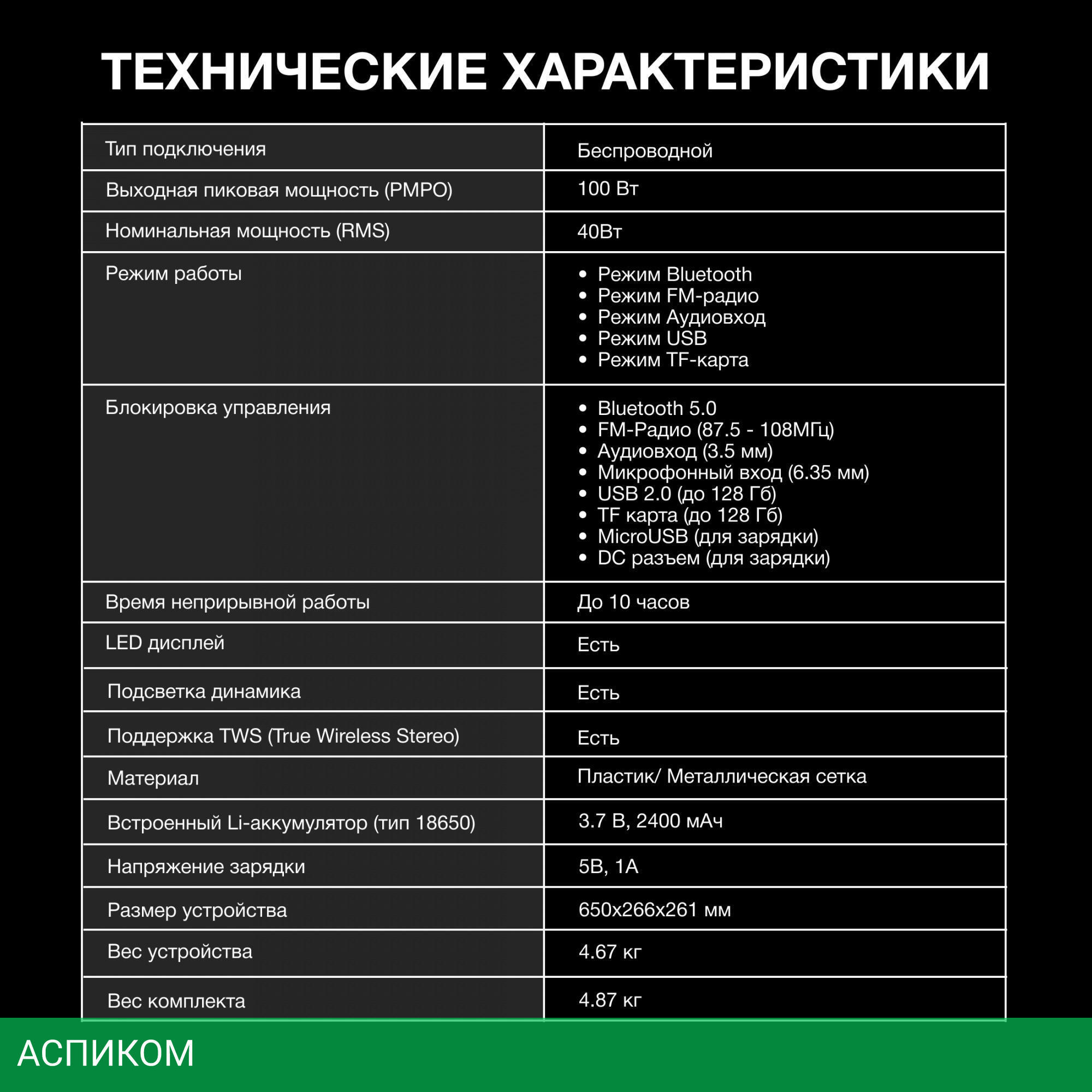 Bluetooth колонка / черный / от сети; от аккумулятора / 40.0 / 5.0 / microSD / нет / пластик