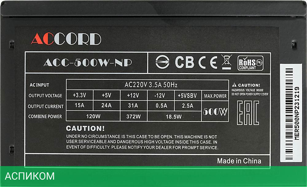 стандартный / 500.0 / черный / ATX / ATX12V 2.3 / нет / с активным PFC / 92.4 / 120 / базовый