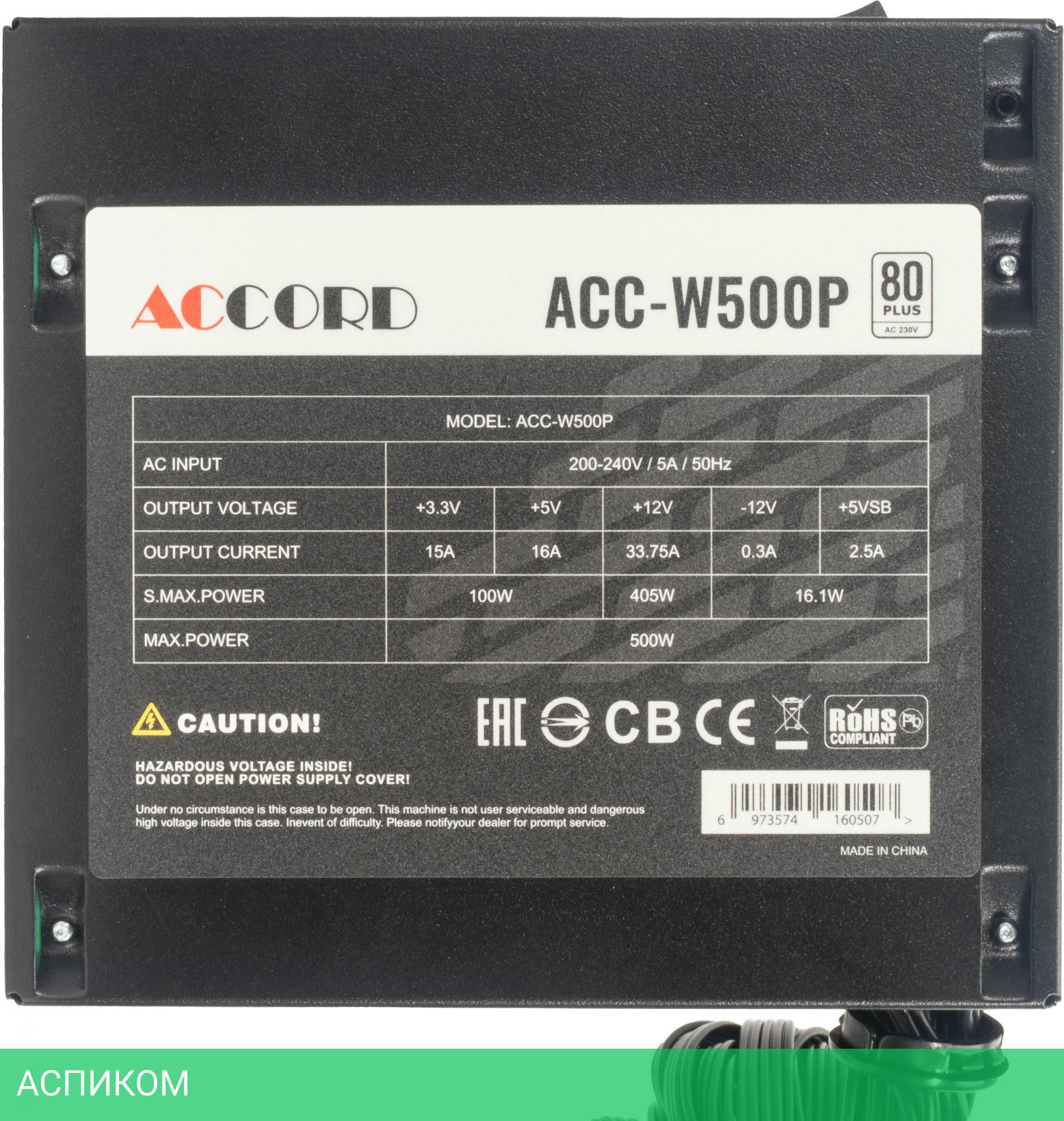 стандартный / 500.0 / черный / ATX / ATX12V 2.4 / с активным PFC / 80.0 / 120