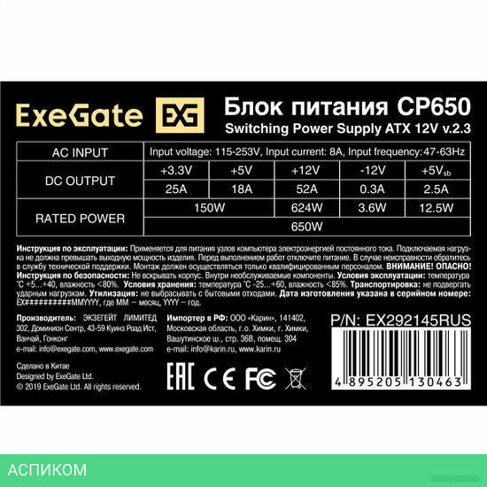стандартный / 650.0 / серебристый / ATX / ATX12V 2.3 / нет / без PFC / 75.0 / 80 / нет