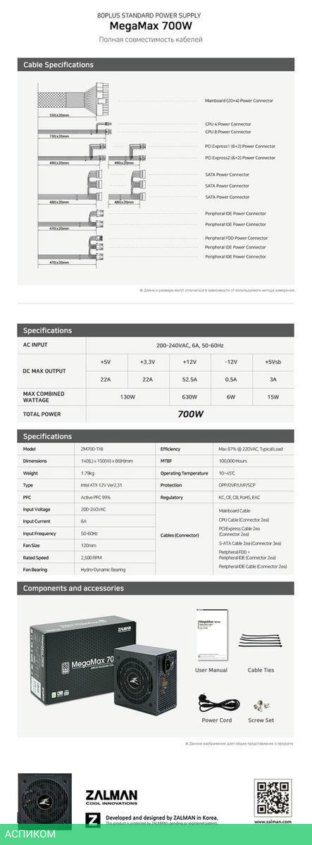 стандартный / 700.0 / черный / ATX / ATX12V 2.31 / нет / с активным PFC / 87.0 / 120 / базовый