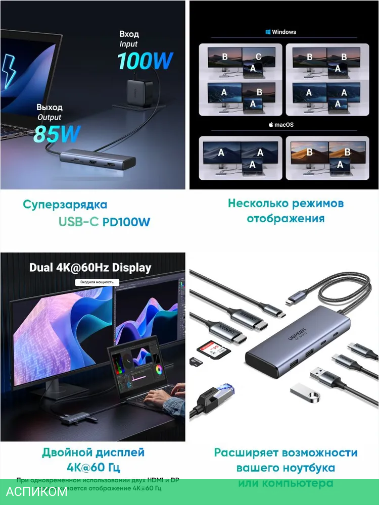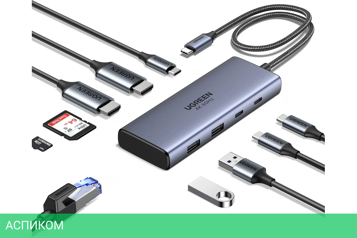вход: USB Type-C, выход: 2xUSB-A 3.2, 2xUSB-C 3.2, 2xHDMI, PD, скорость передачи: до 10Gbps, обратная совместимость с USB 3.0/2.0/1.1