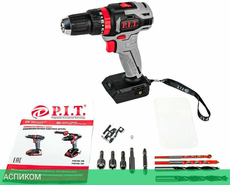 дрель аккумуляторная, коробка, магнитный адаптер для бит, набор сверел, магнитные торцевые головки, бита двухсторонняя, металлическая скоба, руководство по эксплуатации