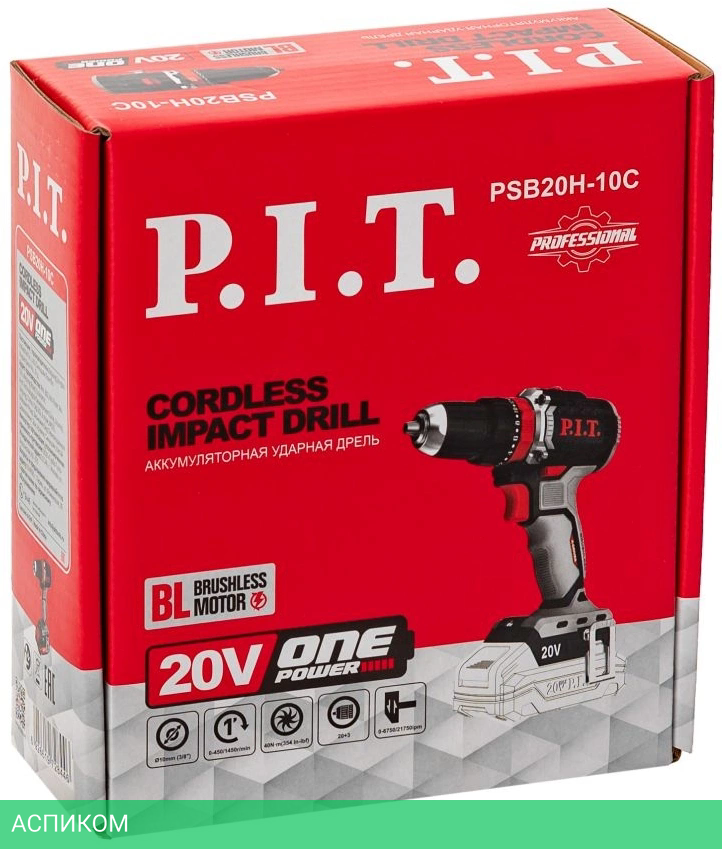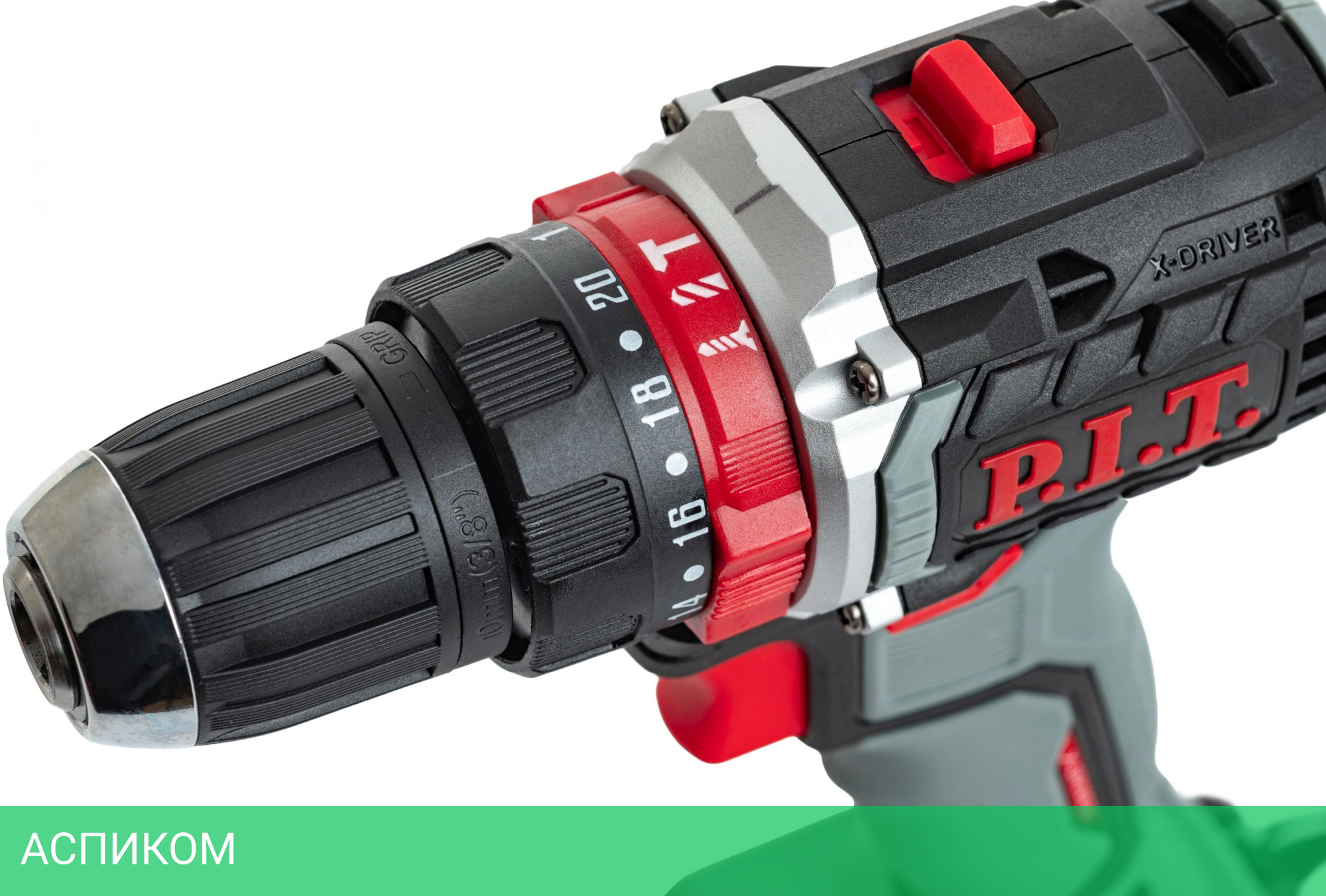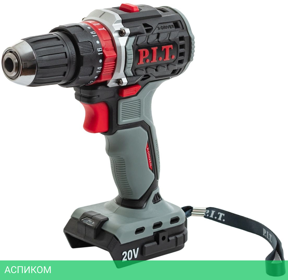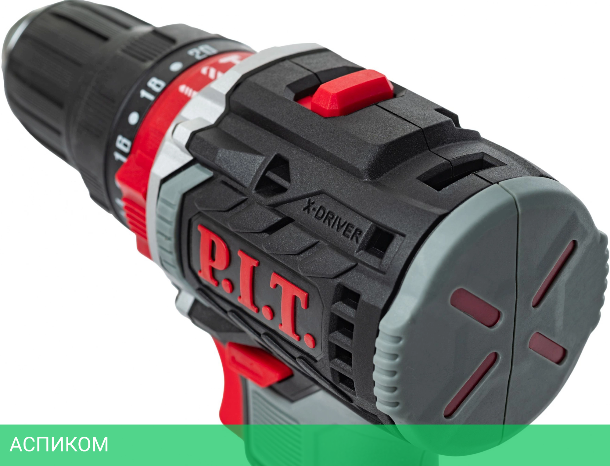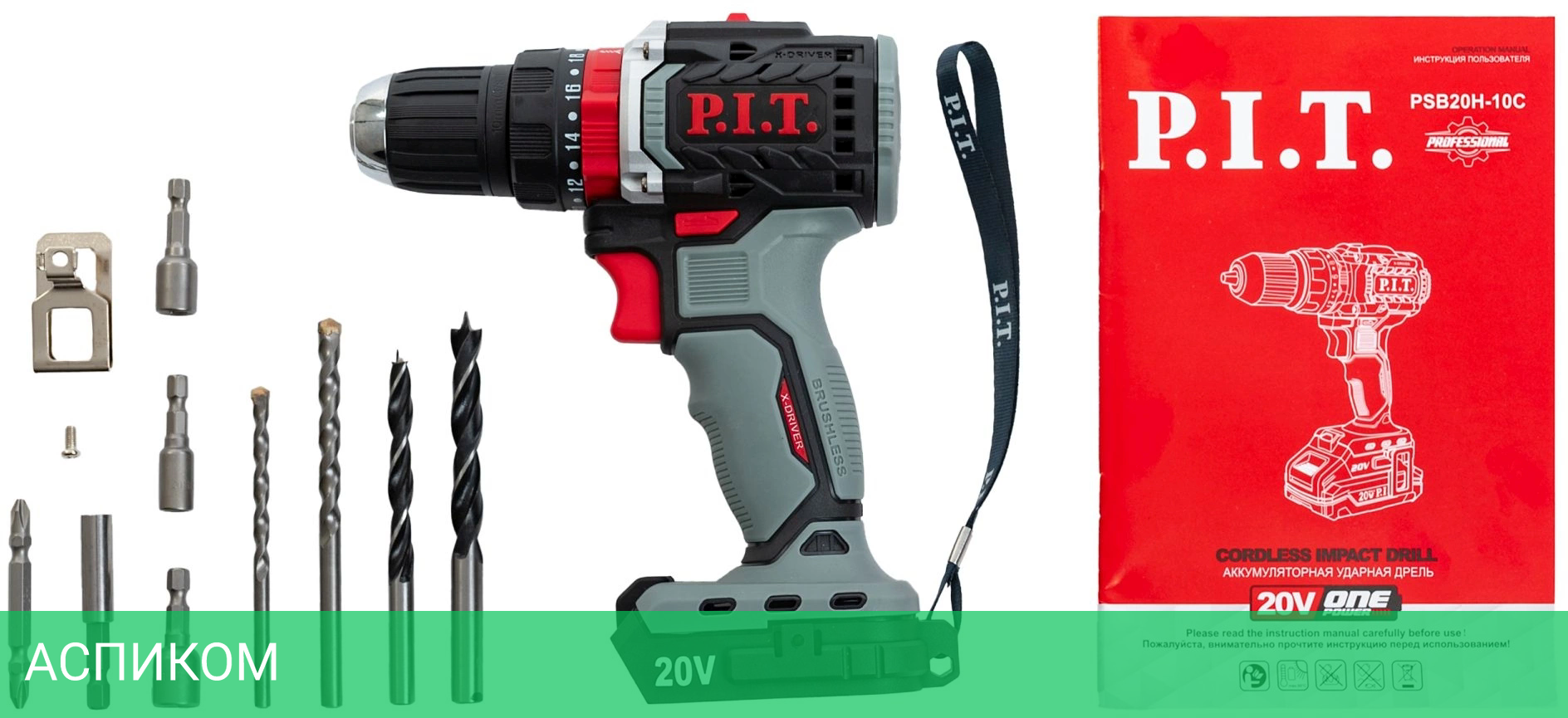 аккумуляторная дрель, скоба для подвешивания, 4 сверла, двусторонняя бита, держатель для бит, 3 торцевые головки, руководство по эксплуатации, адреса гарантийных мастерских, упаковка. Аккумулятор и зарядное устройство приобретаются отдельно в разделе АКБ и ЗУ для P.I.T.