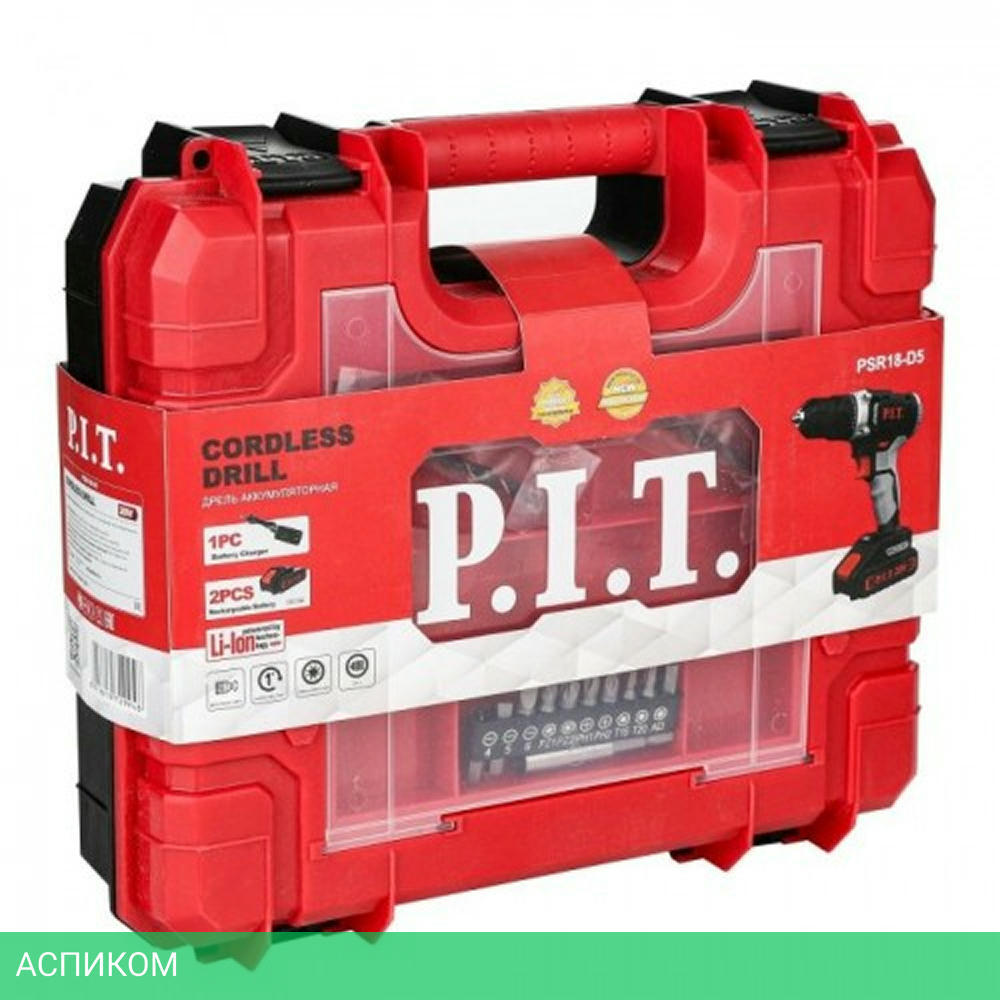 дрель аккумуляторная, устройство зарядное, две аккумуляторные батареи, набор из 10 бит, магнитный адаптер, руководство по эксплуатации, список адресов гарантийных мастерских для ремонта, пластиковый кейс для хранения и транспортировки.