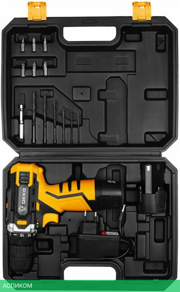 Дрель-шуруповертАккумуляторЗарядное устройство6 шт сверла: 2; 2,5; 3; 4; 5; 6 мм6 шт биты: SL4,6, PH1,2, PZ1,21шт 60 мм магнитный держатель бит
