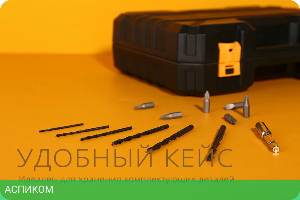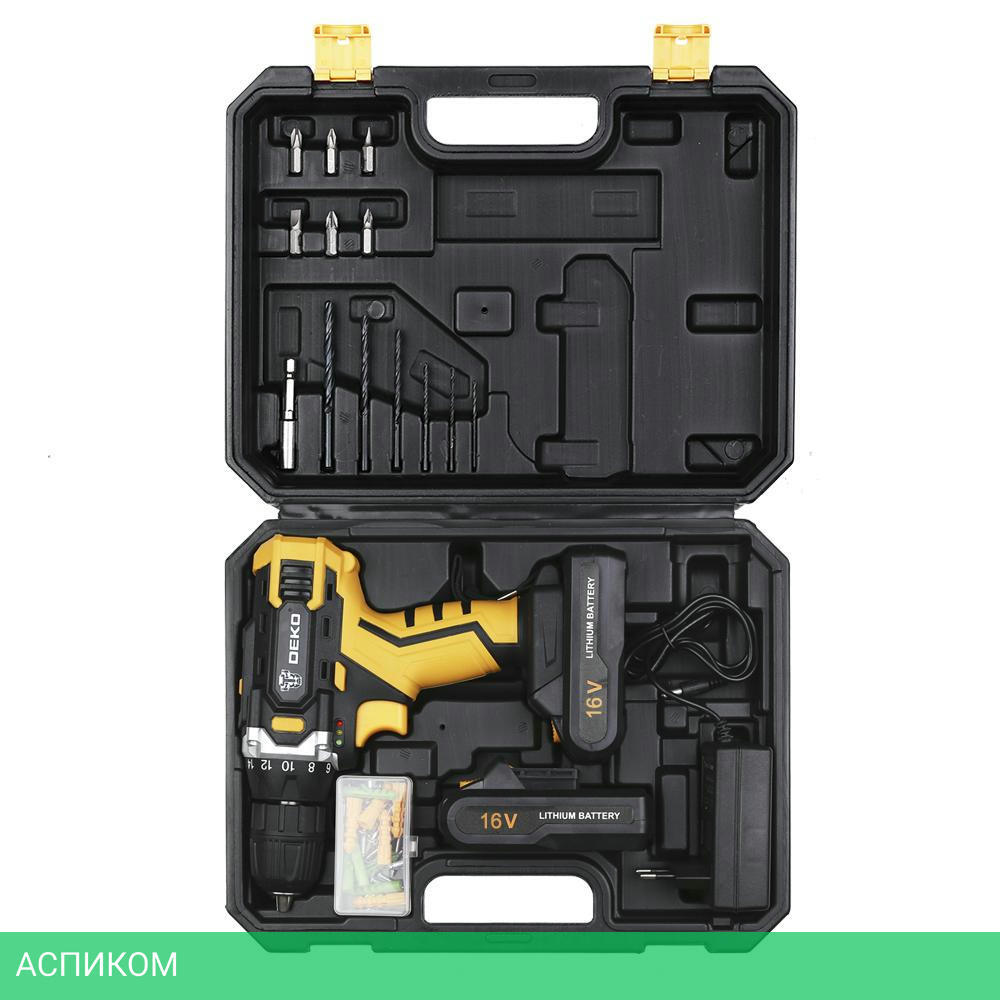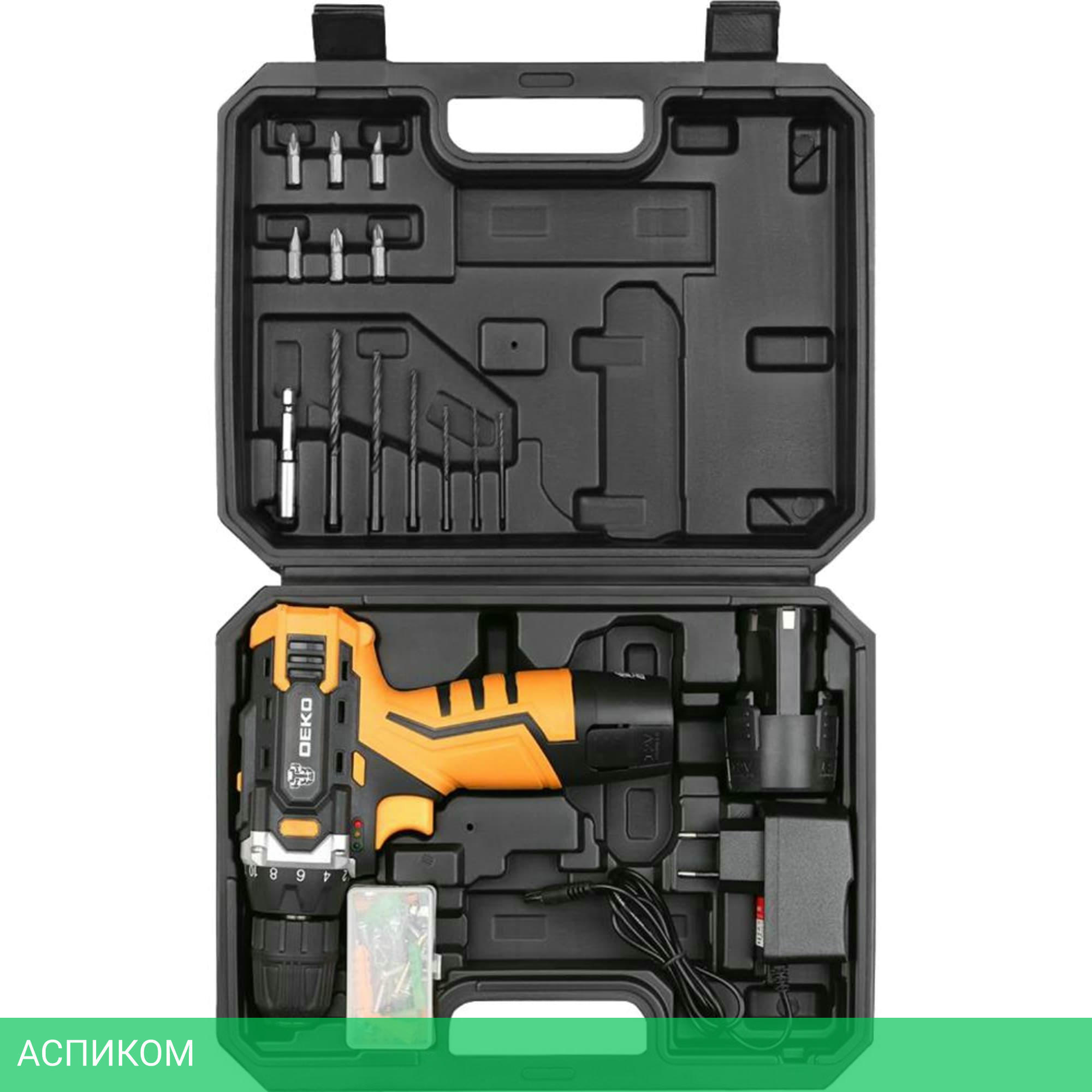 - Дрель-шуруповерт;- Аккумулятор 2 Ач - 2 шт;- Зарядное устройство;- Инструкция;- Кейс;Поставляется в наборе состоящим из:Биты - 6 шт;Сверла - 6 шт;Удлинитель бит - 1 шт;Набор крепежа - 49 шт.