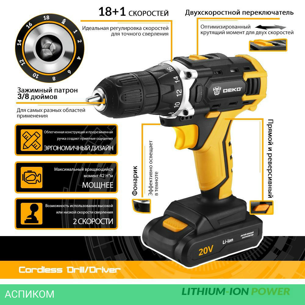 - Дрель-шуруповерт;- Аккумулятор - 2 шт;- Зарядное устройство;- Инструкция;- Картонная коробка.