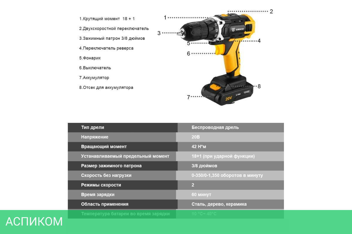 дрель-шуруповерт / аккумулятор / да / 20.0 / быстрозажимной / нет / 42.0 / 0.8 — 10 мм / 1350.0 / 1.36 / Li-ion / 1.5