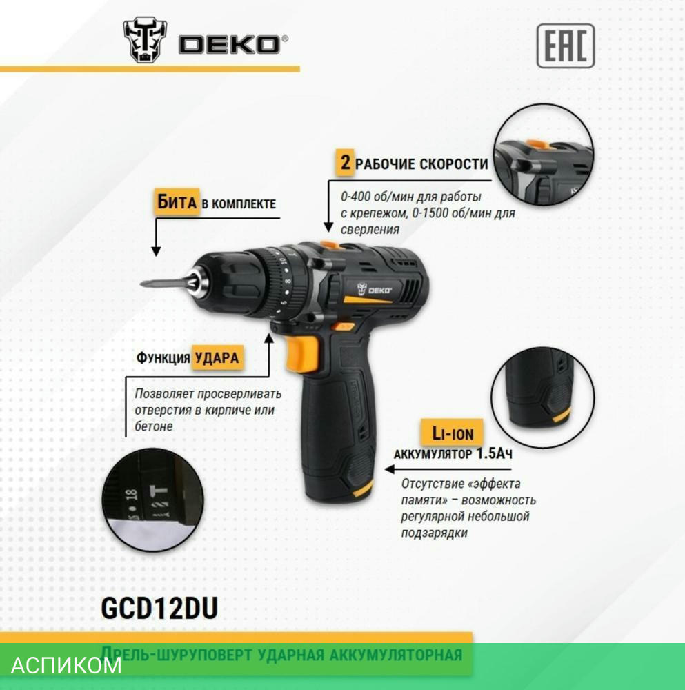Аккумуляторная ударная дрель-шуруповерт, аккумулятор, зарядное устройство, бита, руководство по эксплуатации.