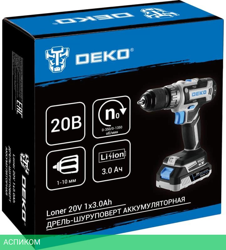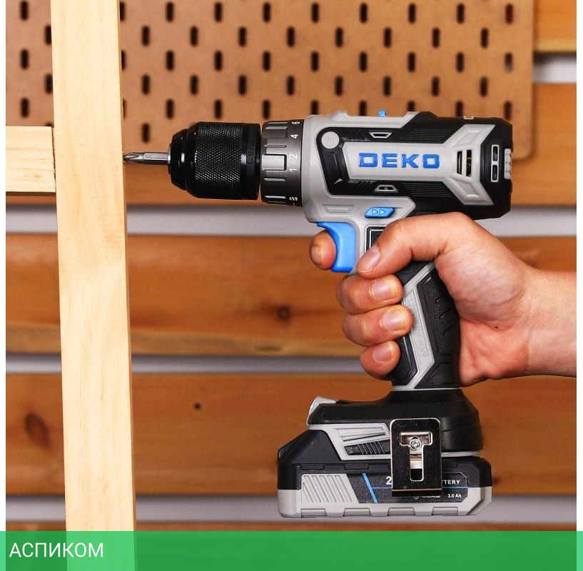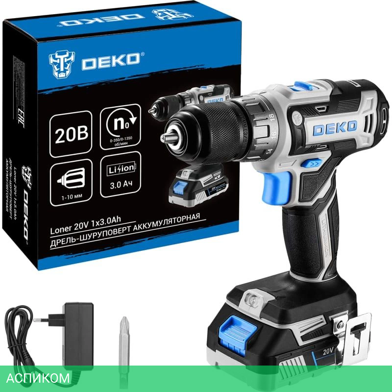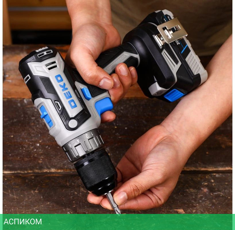 Дрель-шуруповерт, АКБ, зарядное устройство, крючок для ремня, руководство по эксплуатации.