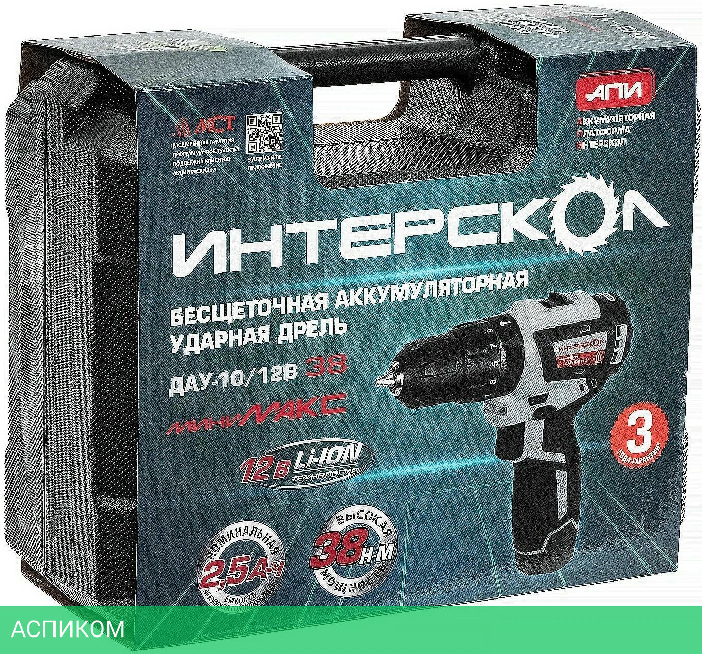 Дрель-шуруповерт, АКБ АПИ Т 12 В емкостью 2,5 А•ч (30 Вт•ч) - 2 шт., часовое моноблочное зарядное устройство, пластиковый кейс, инструкция по эксплуатации и безопасности.