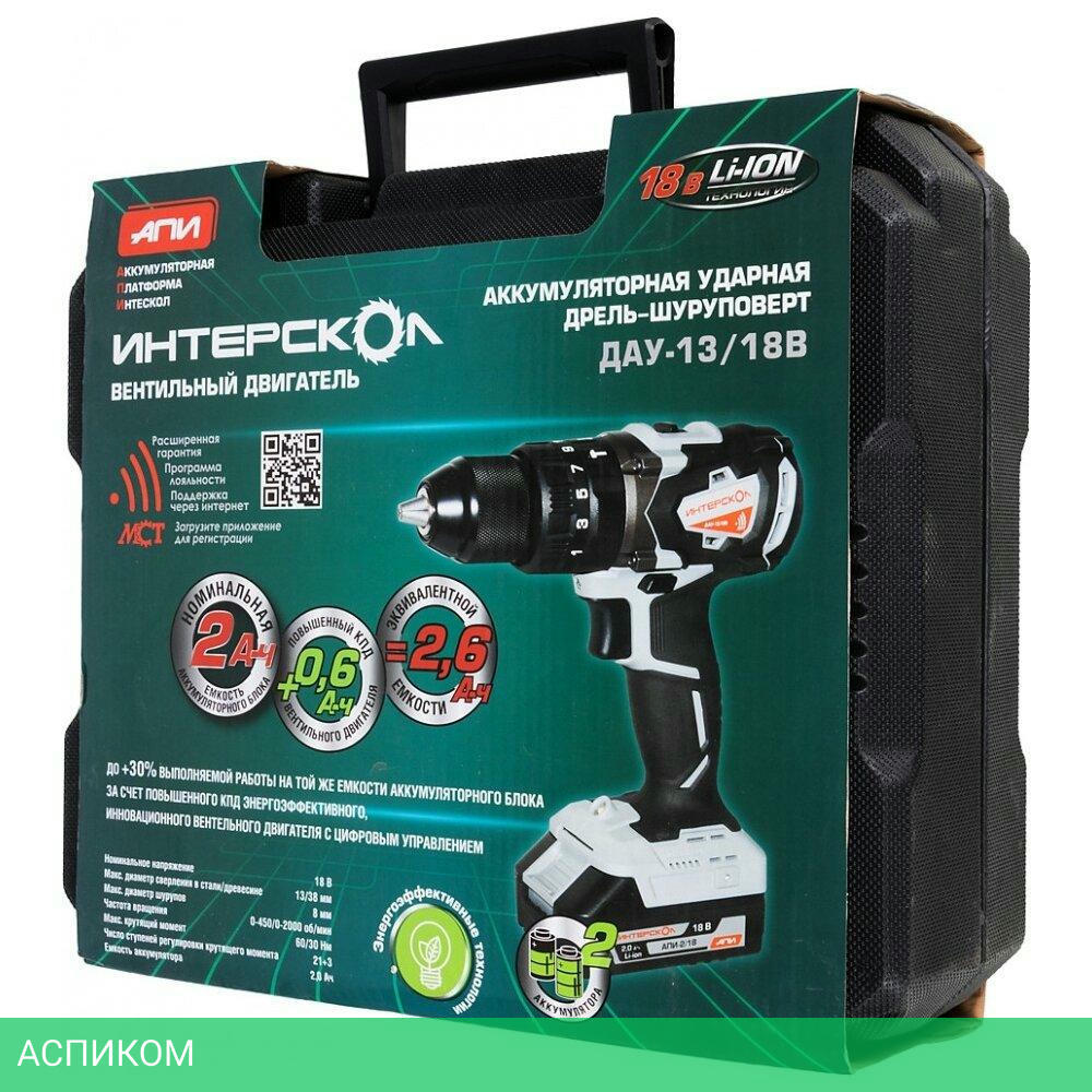дрель-шуруповерт / аккумулятор / да / 18.0 / быстрозажимной / да / 60.0 / 13 мм / 2000.0 / 1.7 / Li-ion / 2.0
