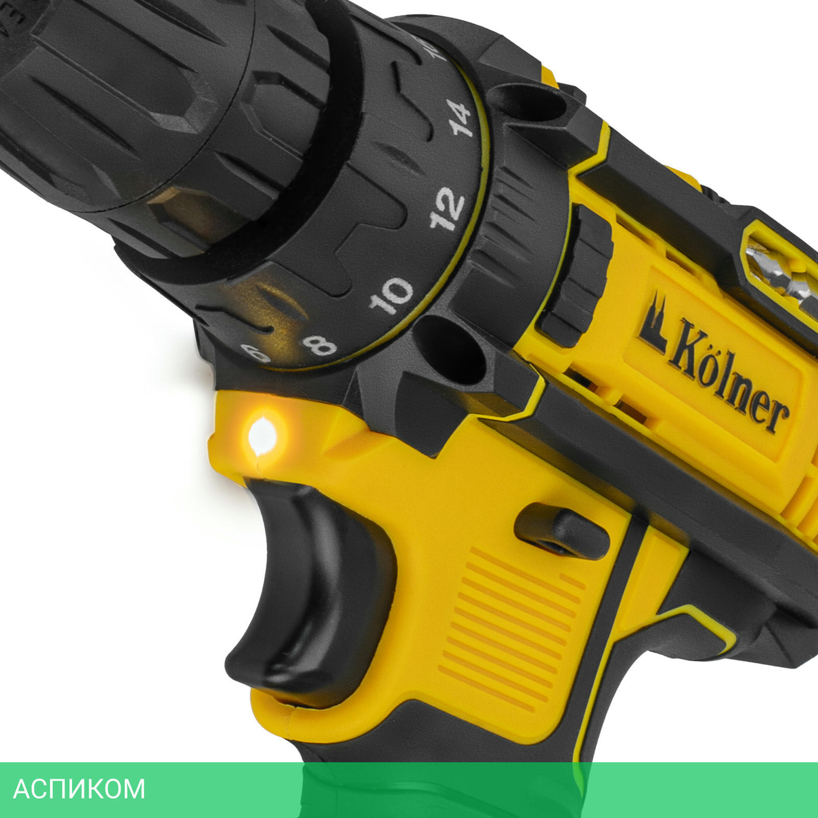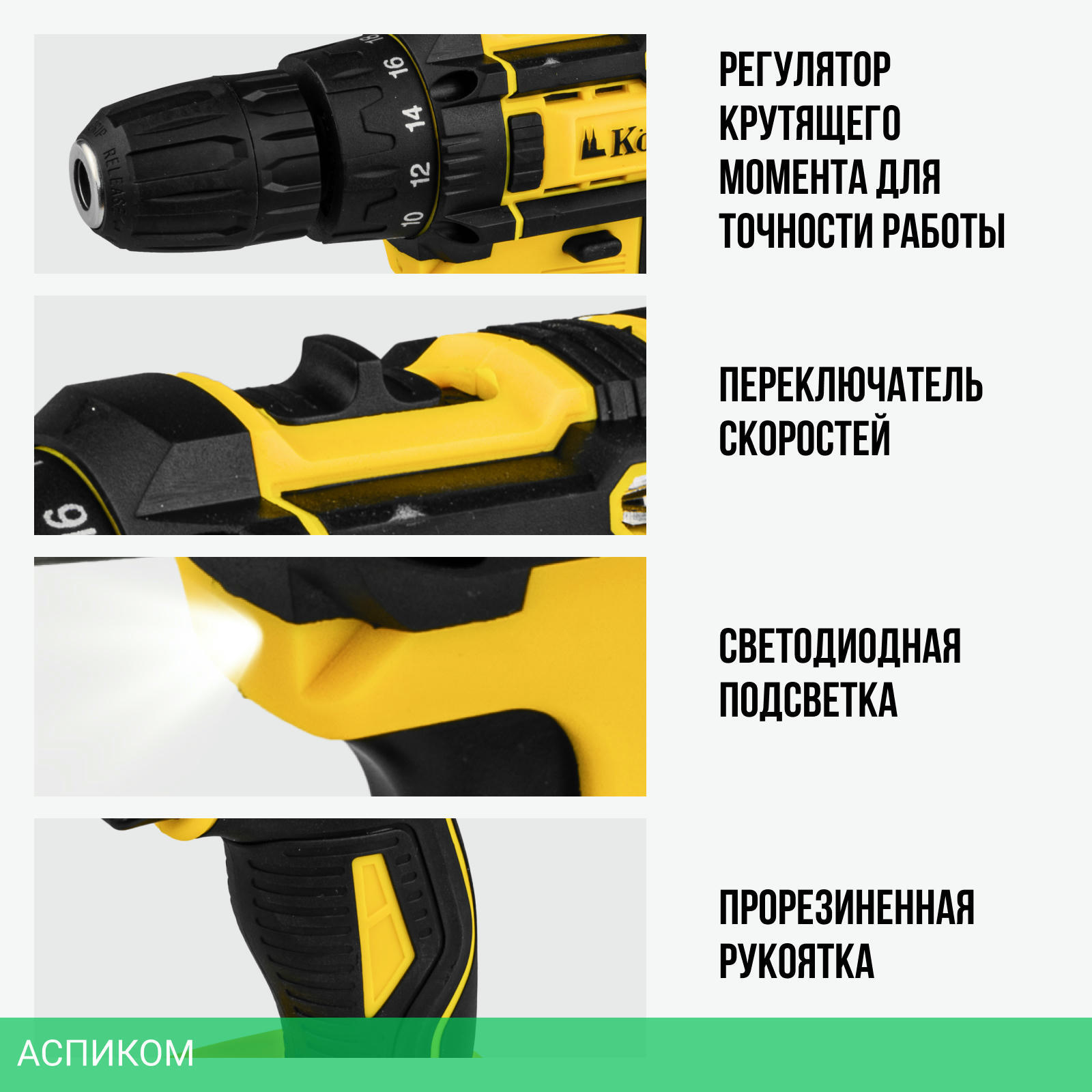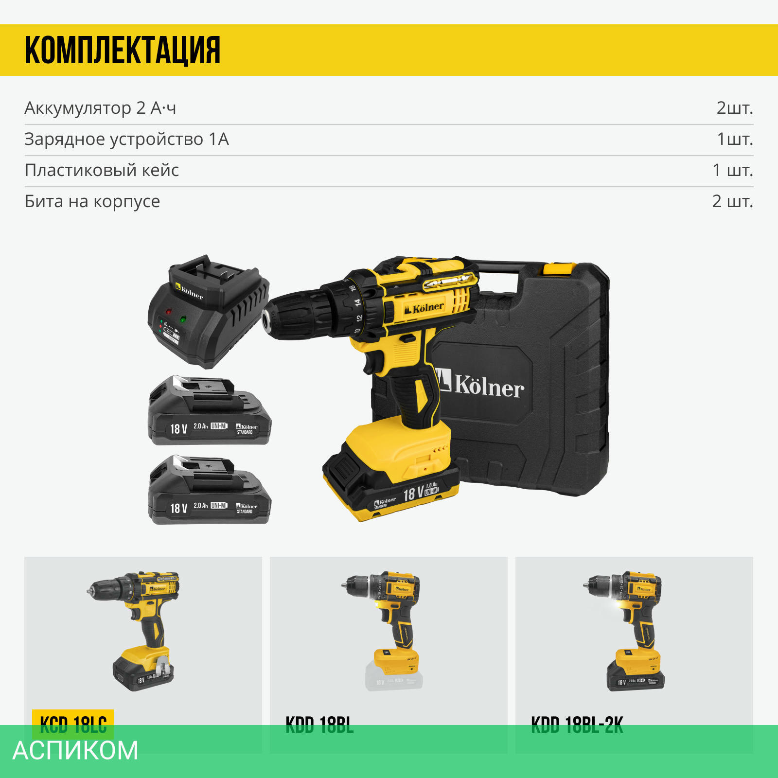 дрель-шуруповерт, бита (2 шт.), крепление для ремня, кейс, аккумулятор - 2 шт., зарядное устройство, документация