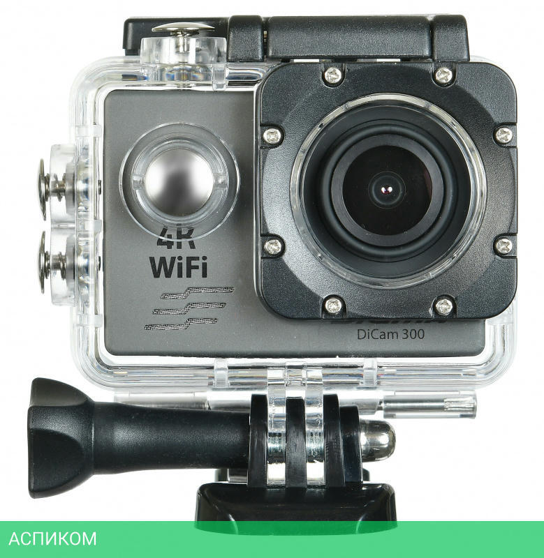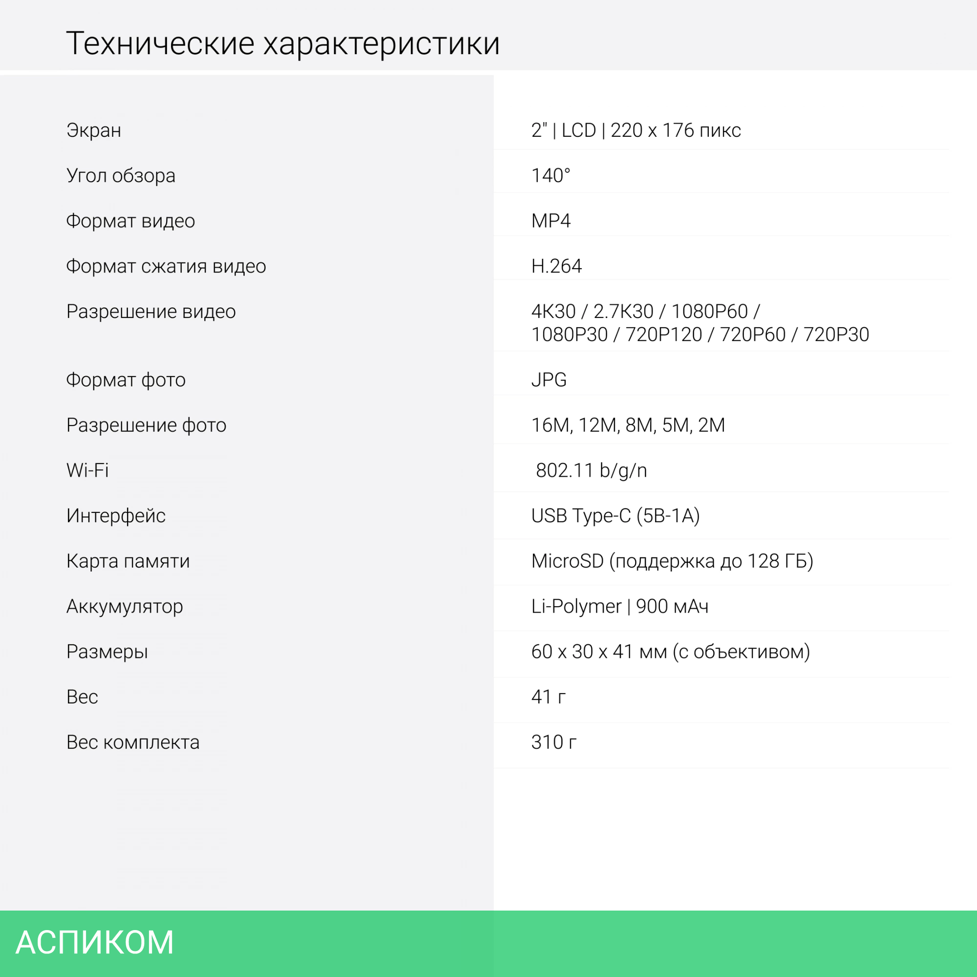 - камера; - водонепроницаемый бокс; - основное крепление; - крепление на руль велосипеда; - крепление на шлем; - адаптер-переходник; - адаптер на резьбу; - рамка; - повязка-бандаж; - аккумулятор; - USB-кабель; - руководство пользователя; - гарантийный талон.