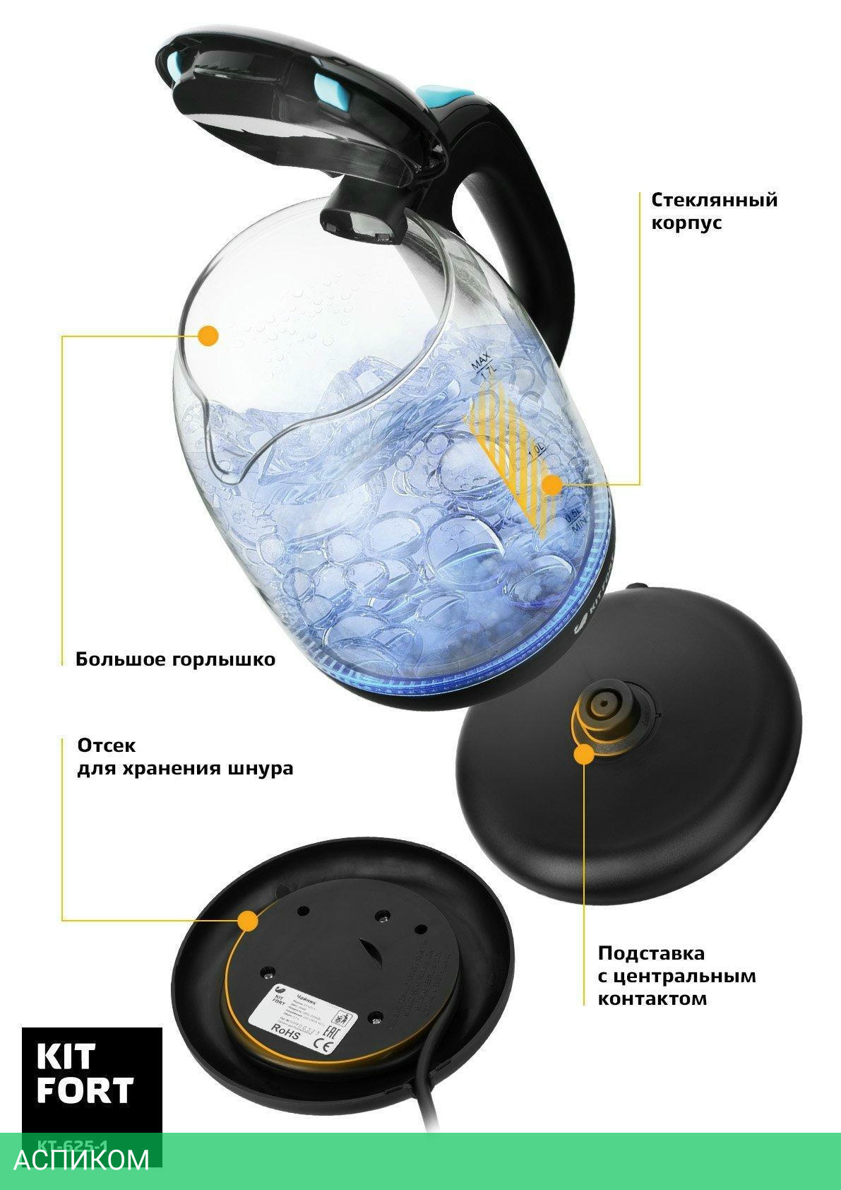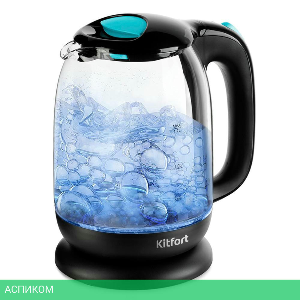 электрочайник / 2200.0 / 1.7 / механическое / черный; голубой / да / пластик; стекло