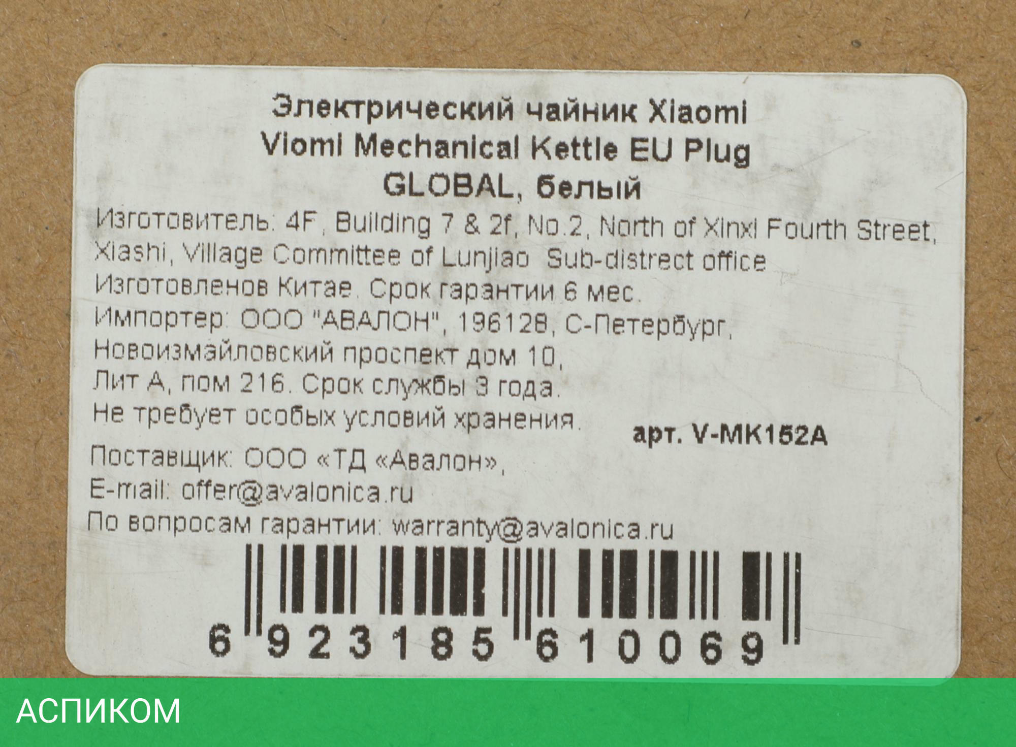 электрочайник / белый / 1800.0 / 1.5 / механическое / нет / пластик