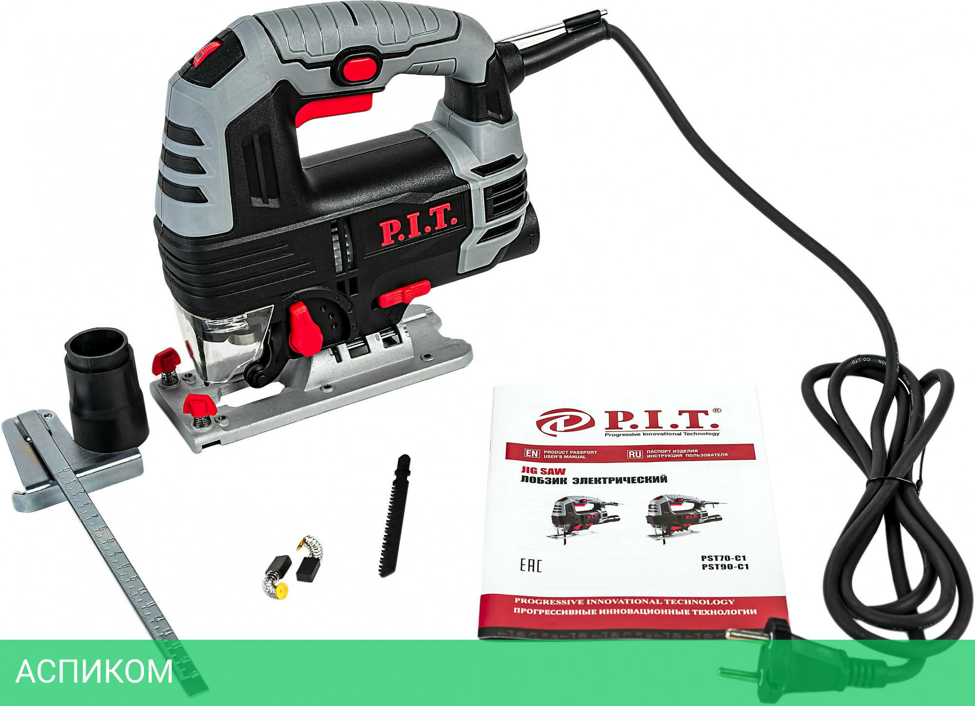 - лобзик- коробка- пильное полотно по дереву- параллельный упор- шестигранный ключ- адаптер для подключения пылесоса- щетки угольные- руководство по эксплуатации