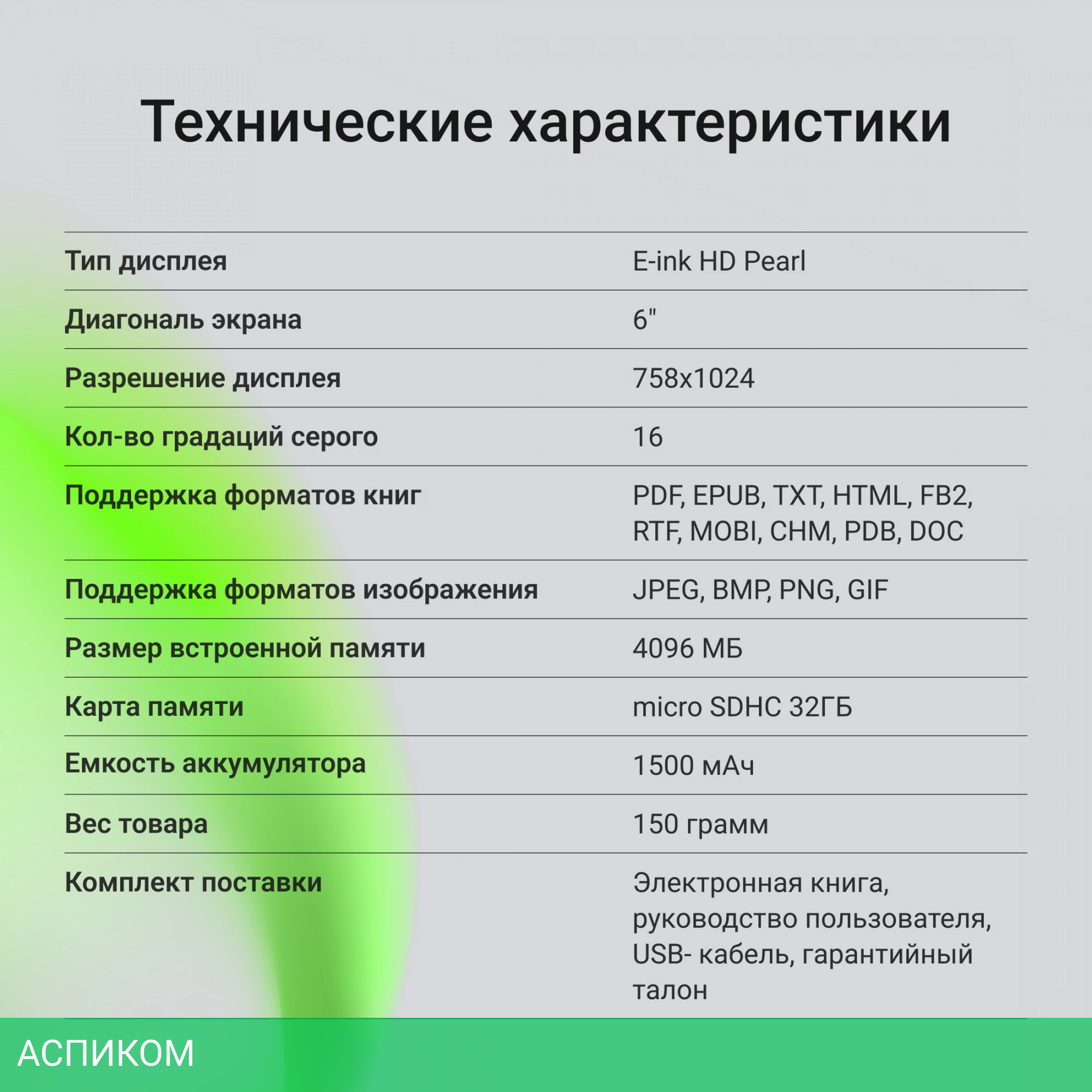 серый / нет / нет / E-Ink Pearl HD / 6.0 / нет / нет / 758x1024 / нет / пластик