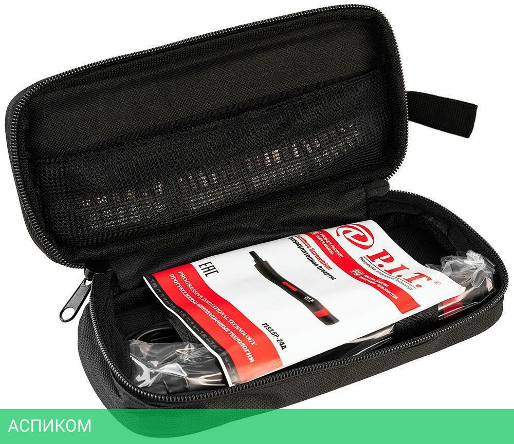 Отвертка аккумуляторная, USB-кабель, переходник, биты (23 шт), чехол, руководство по эксплуатации