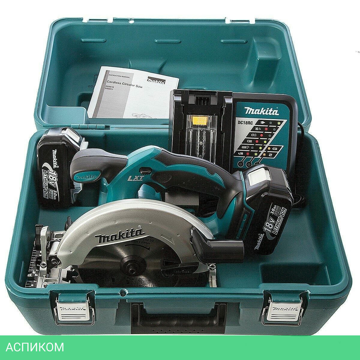 электропила, один аккумулятор, зарядное устройство, кейс, инструкция