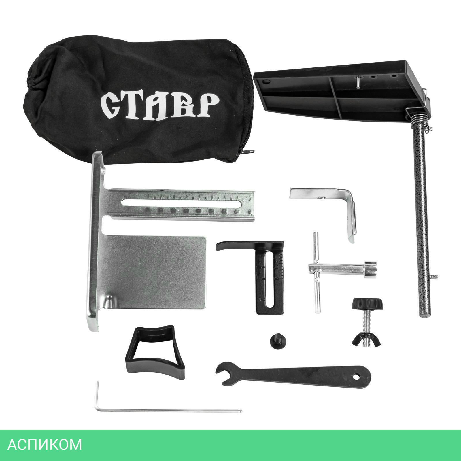 танина с креплением, параллельный упор с креплением,пылесборный мешок, угольные щетки (комплект), ключ для установки строгальных ножей, шестигранный ключ, упор-фиксатор выключателя,возвратный кожух для защиты строгальных ножей,упор для выборки четверти (ф