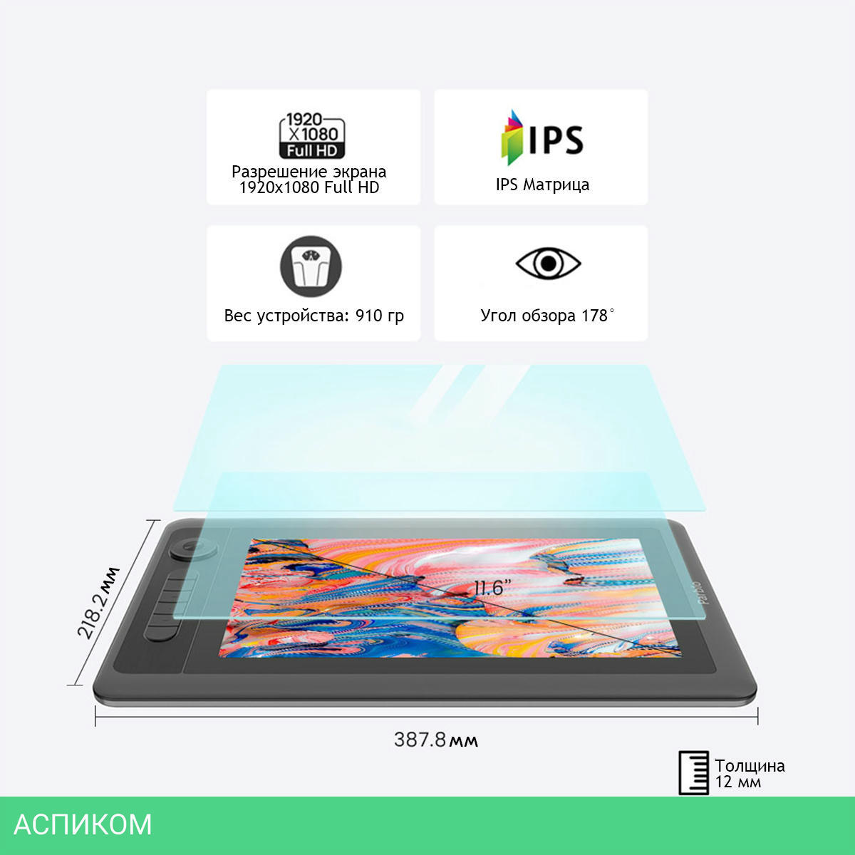 проводной / перьевой; сенсорный / перо / 11.6 / черный / 256х144 / 5080.0 / 200.0 / да / USB Type-C; HDMI