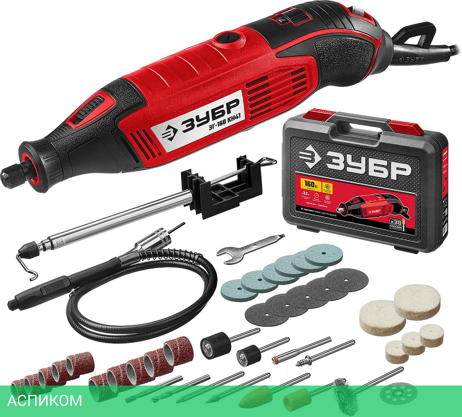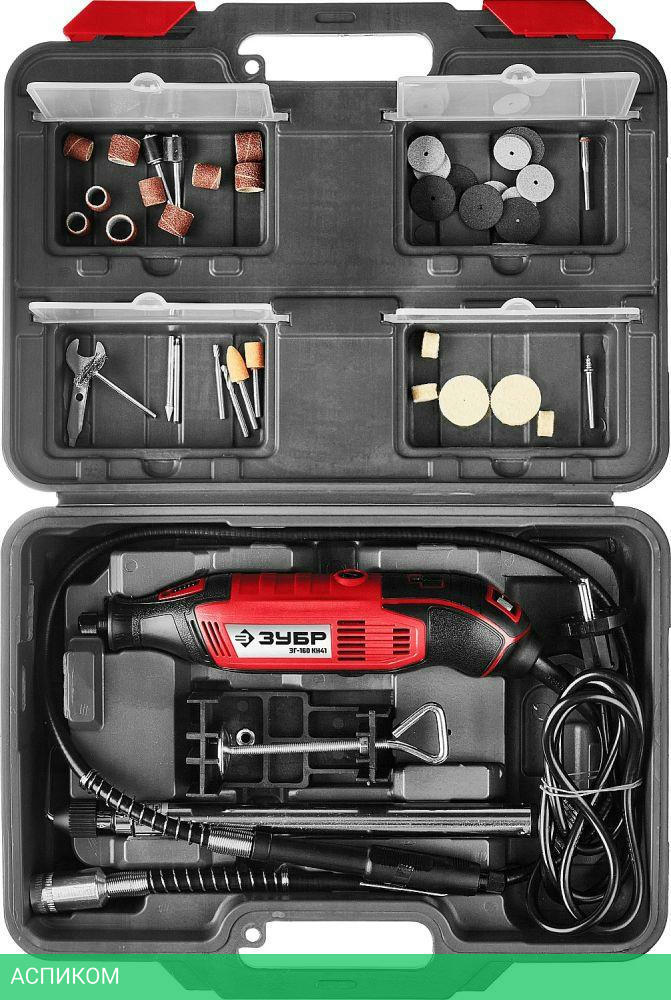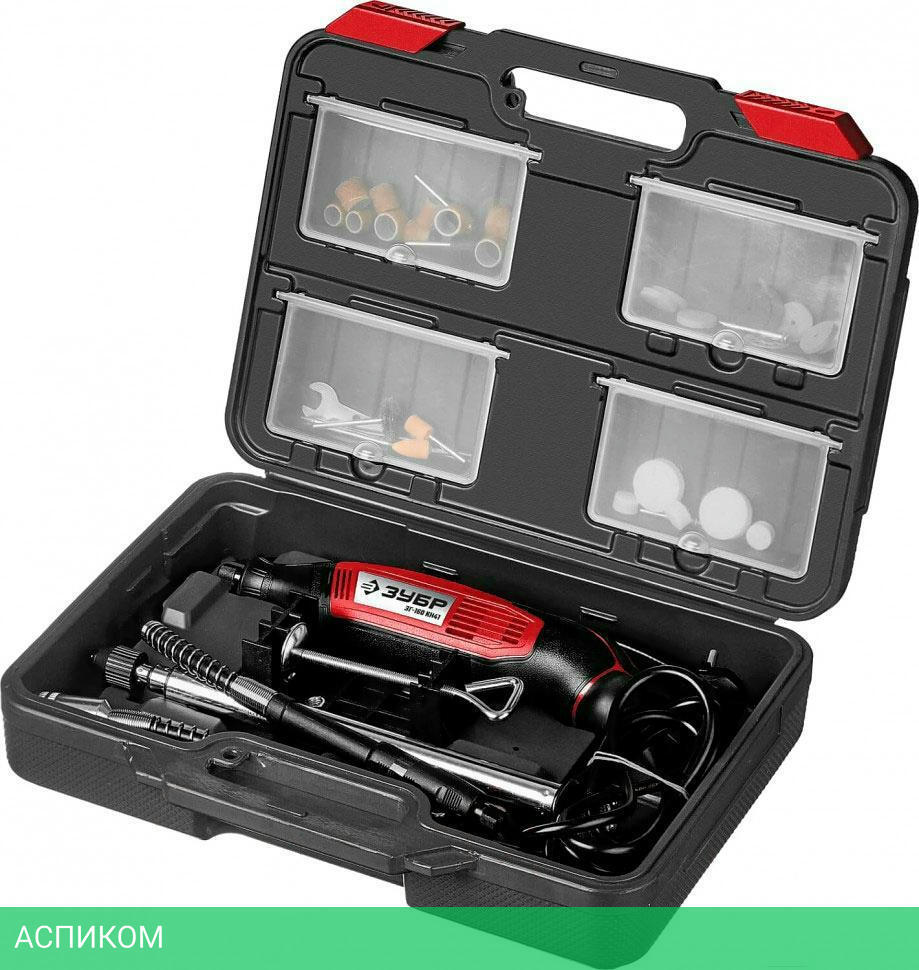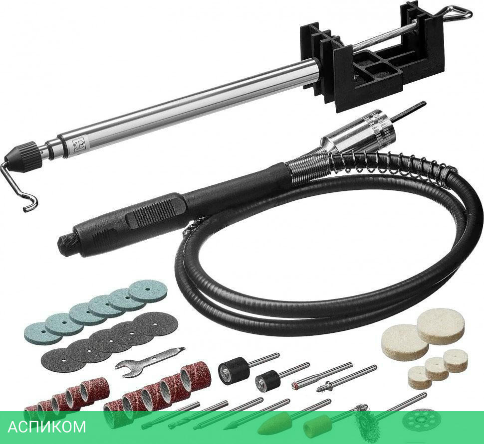Гравер электрический 1Гибкий вал 1Штатив телескопический 1Кронштейн штатива 1Цанга 1 3.2ммШарошка абразивная на шпильке цилиндрическая 1Шарошка абразивная на шпильке коническая 1Шарошка алмазная коническая 1Шарошка алмазная сферическая 1Шарошка по дереву цилиндрическая (борфреза) 1Сверло 1Цилиндр шлифовальный D9 мм 5Цилиндр шлифовальный D12 мм 5Абразивный шлифовальный круг по металлу 6Отрезной абразивный круг 5Войлочный полировальный круг D12 мм 3Войлочный полировальный круг D25 мм 2Державка для шлифовальных цилиндров D9 мм 1Державка для шлифовальных цилиндров D12 мм 1Державка для войлочных кругов 1Державка для отрезных кругов 1Щетка-крацовка 1Диск отрезной алмазный 1Ключ гаечный 1Кейс 1Руководство по эксплуатации 1