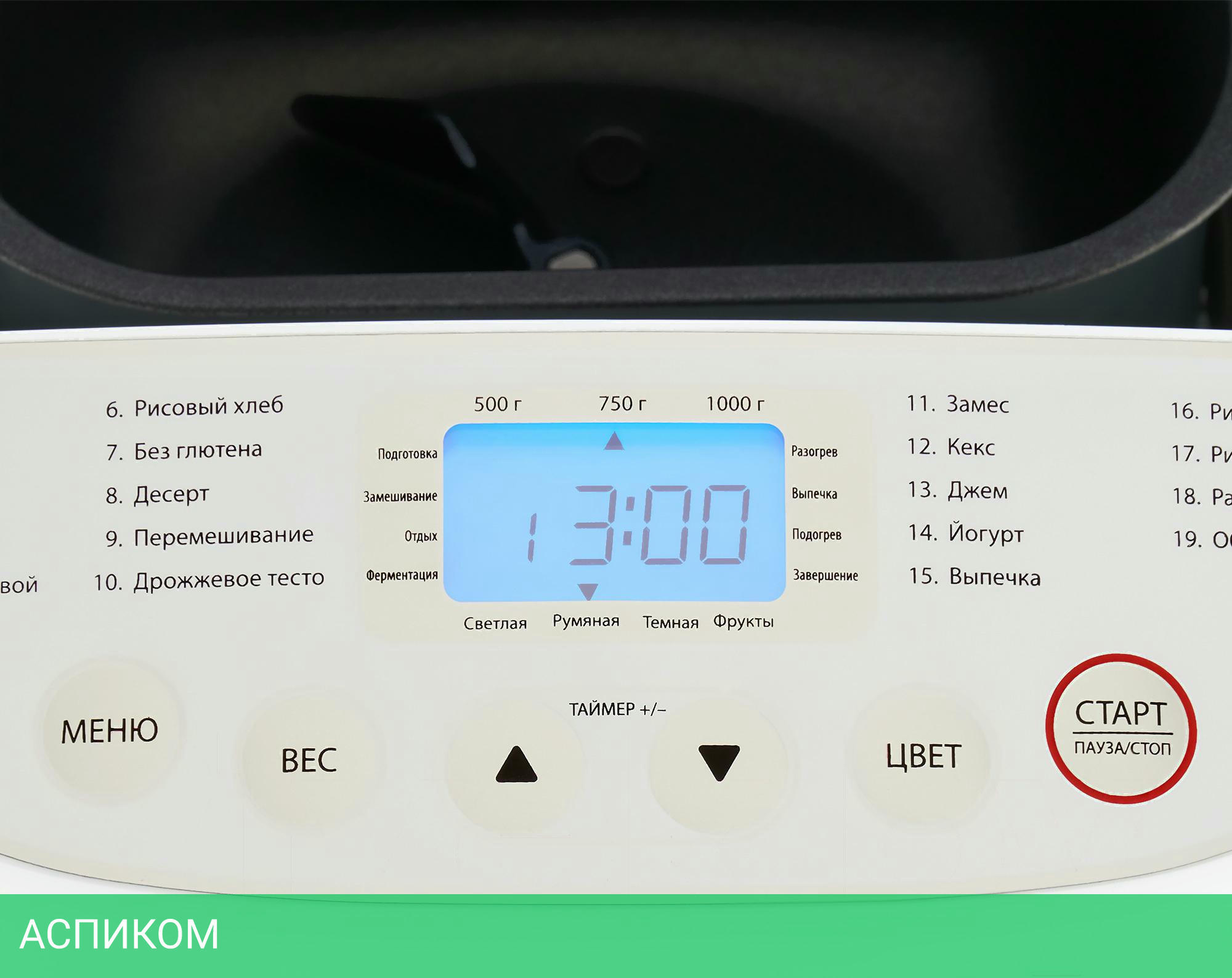 кекс, сладкая выпечка, безглютеновая выпечка, йогурт, французский хлеб, быстрая выпечка, десерт, рисовый хлеб, цельнозерновой хлеб, молочная каша, дрожжевое тесто, рисовое вино, выпечка, смешивание, замес теста, разморозка, жарка, джем, базовый режим