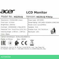 ✅ Acer Nitro KG251QP3biip - это 24.5-дюймовый игровой монитор с матрицей VA, который обеспечивает высокую частоту обновления 180 Гц и время отклика до 2 мс (GtG) и 0.5 мс (MPRT), что делает его отличным выбором для динамичных игр и киберспорта. Разрешение Full HD (1920x1080) и плотность пикселей 90 ppi обеспечивают четкое и детализированное изображение, а матовое покрытие экрана минимизирует блики при ярком освещении.