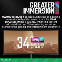 ✅ Диагональ 34 дюйма и изогнутый экран с радиусом изгиба 1500R создают эффект полного погружения в игровой процесс. Вы сможете насладиться каждым моментом, благодаря широкому углу обзора в 178°.