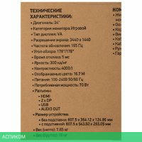 <p> 34", 3440x1440, 21:9, изогнутый, кривизна 1000R, VA, 165 Гц, яркость 300 нит, динамики, HDMI+DisplayPort, регулировка высоты </p>