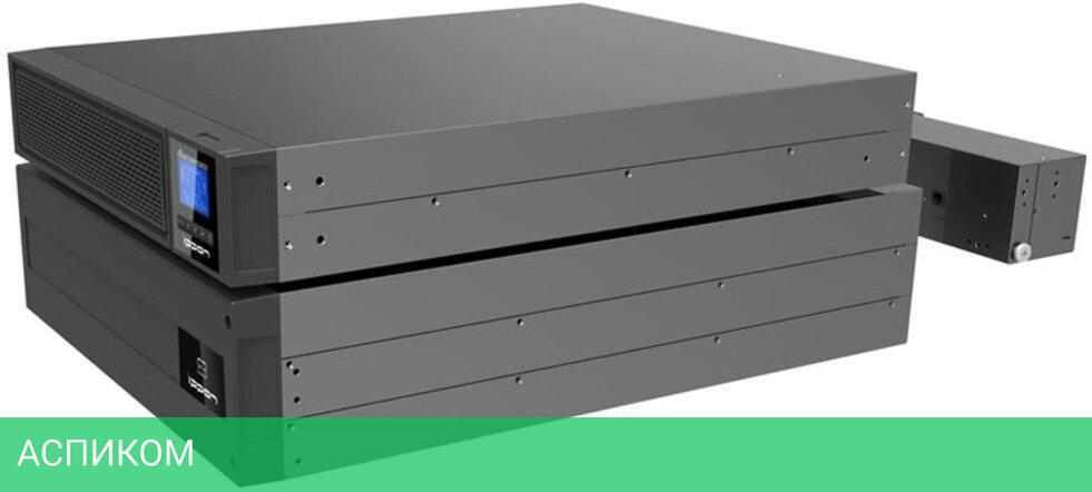 Преобразовательный и батарейный модули, выносной блок PDU, кабель питания, 2 кабеля для нагрузки, USB кабель, ножки для вертикального монтажа, руководство, крепеж для 19" серверного шкафа
