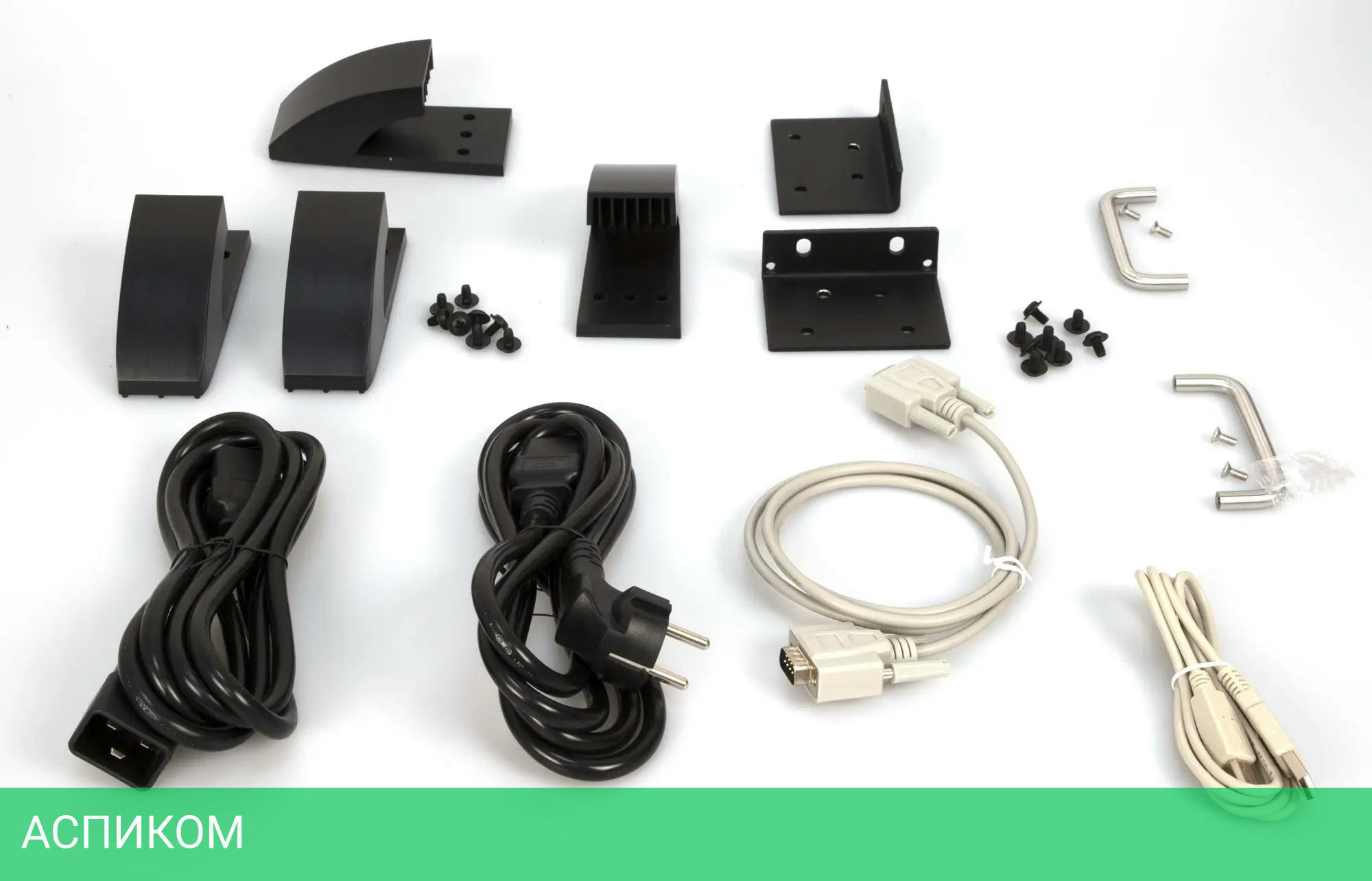 ИБП, входной шнур питания 1.8 м, выходной шнур питания 1.8 м, коммуникационный кабель RS-232/DB9, USB-кабель, ушки для монтажа в стойку, стеллажная башенная стойка