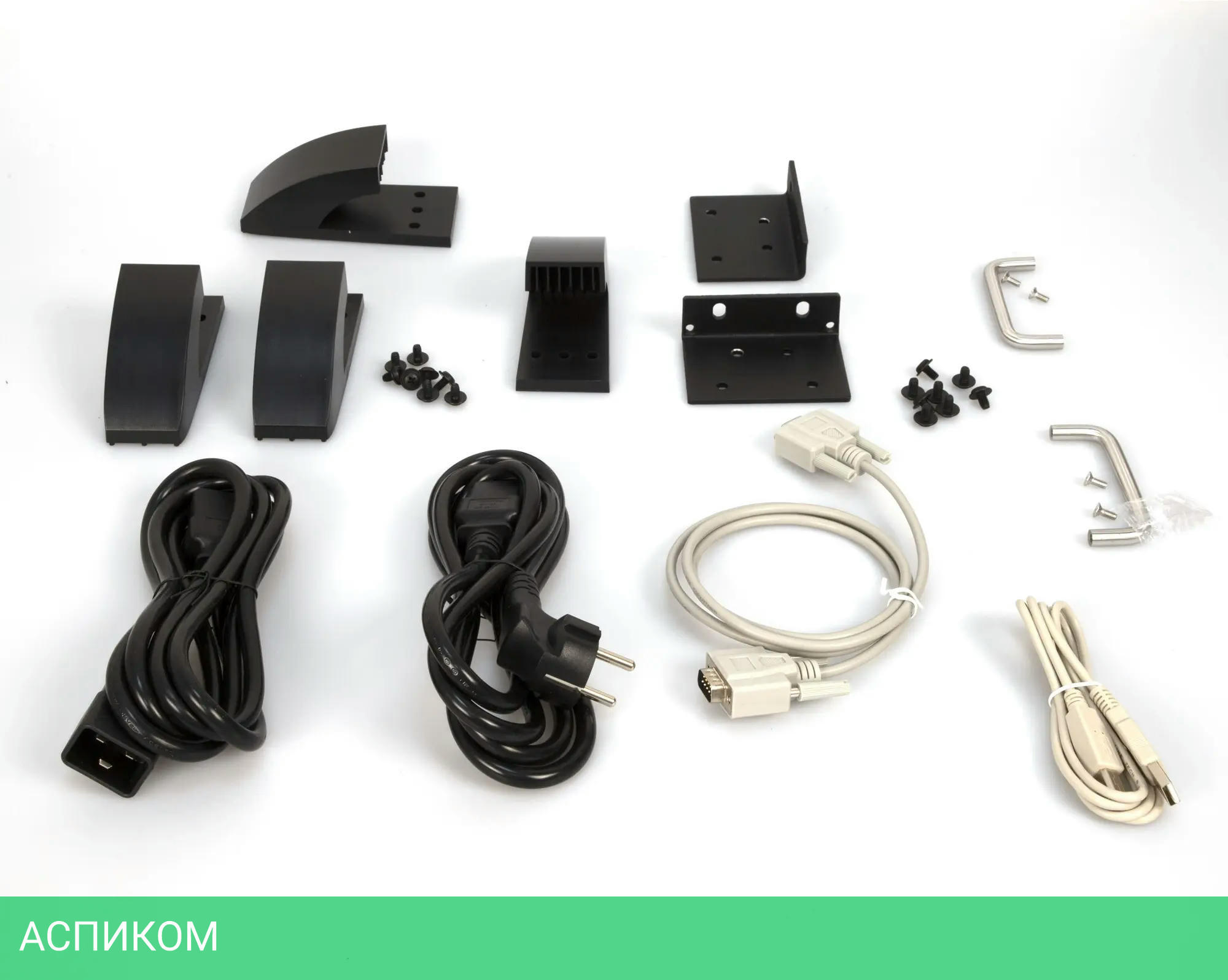 ИБП, входной шнур питания 1.8 м, выходной шнур питания 1.8 м, коммуникационный кабель RS-232/DB9, USB-кабель, ушки для монтажа в стойку, стеллажная башенная стойка
