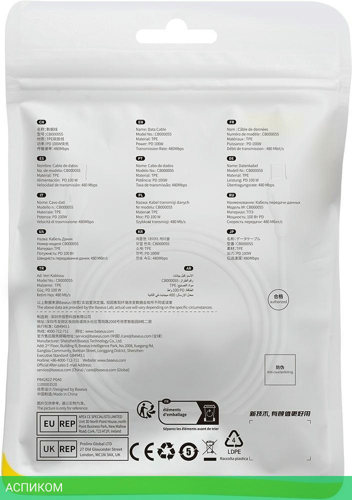 кабель / для компьютера; для смартфонов и планшетов / передача данных; питание устройств / USB 2.0 Type-C / 1.2 / белый