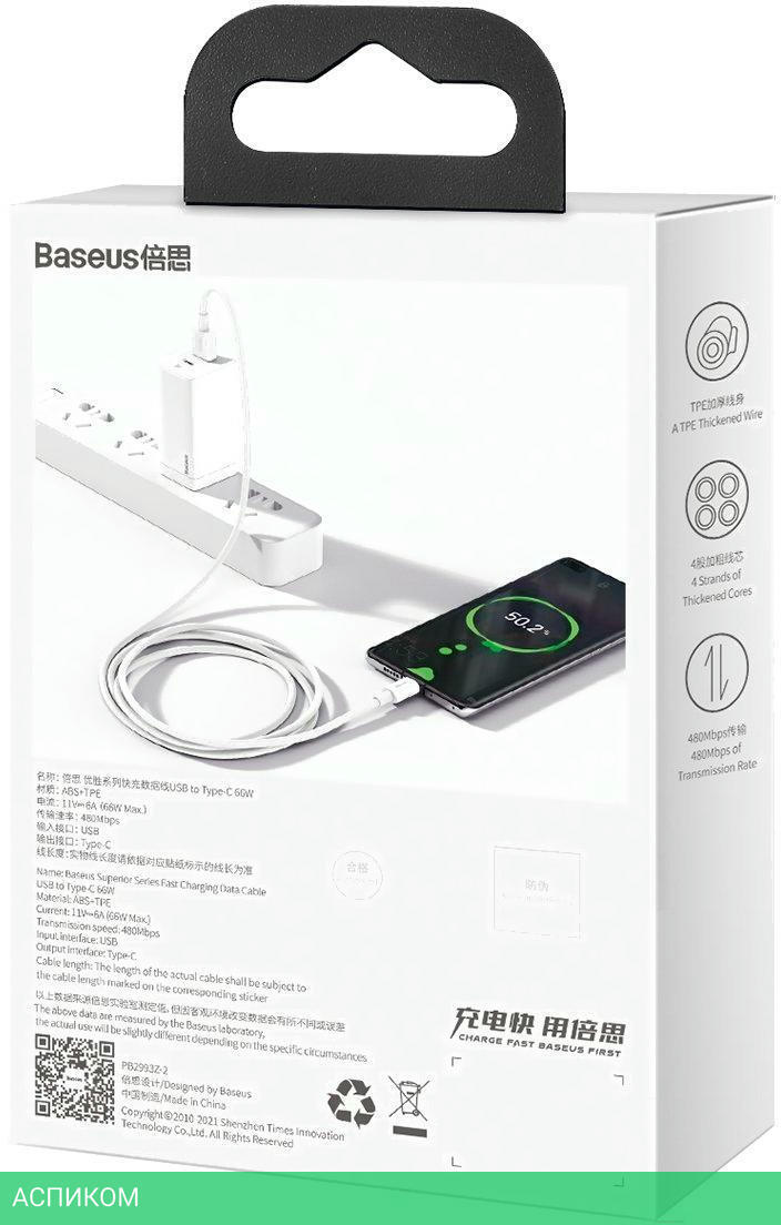 кабель / для смартфонов и планшетов / передача данных; питание устройств / USB 2.0 Type-C / 1.0 / белый