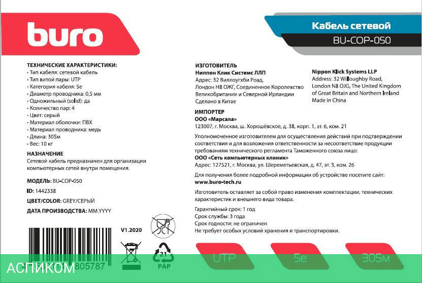 Кабель сетевой Buro BU-COP-050 cat5E 305м серый - купить по выгодной цене | АСПИКОМ