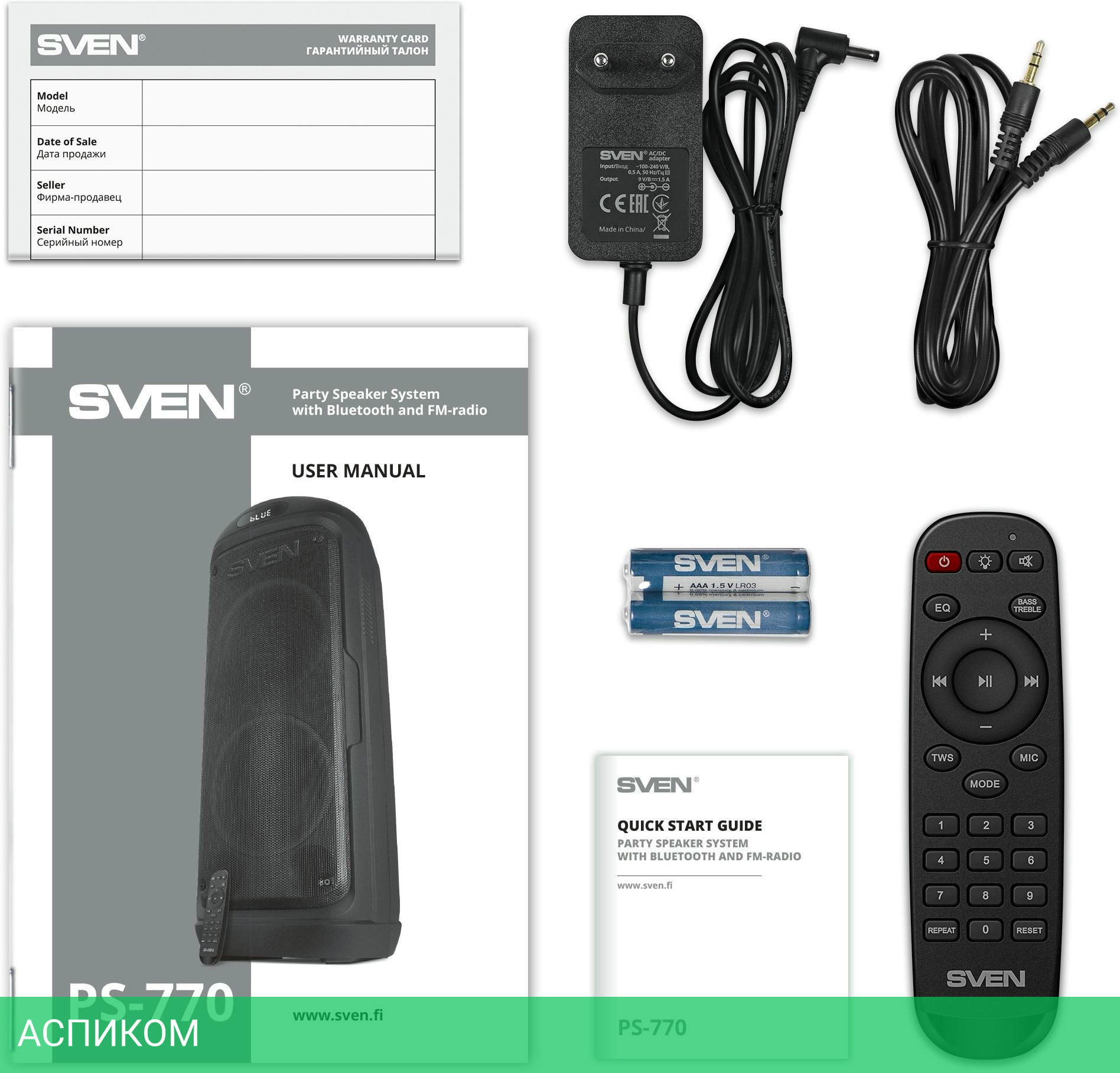 - пульт ДУ - батарейки для пульта ДУ (2xААА) - аудиокабель 3.5 мм - кабель питания - документация