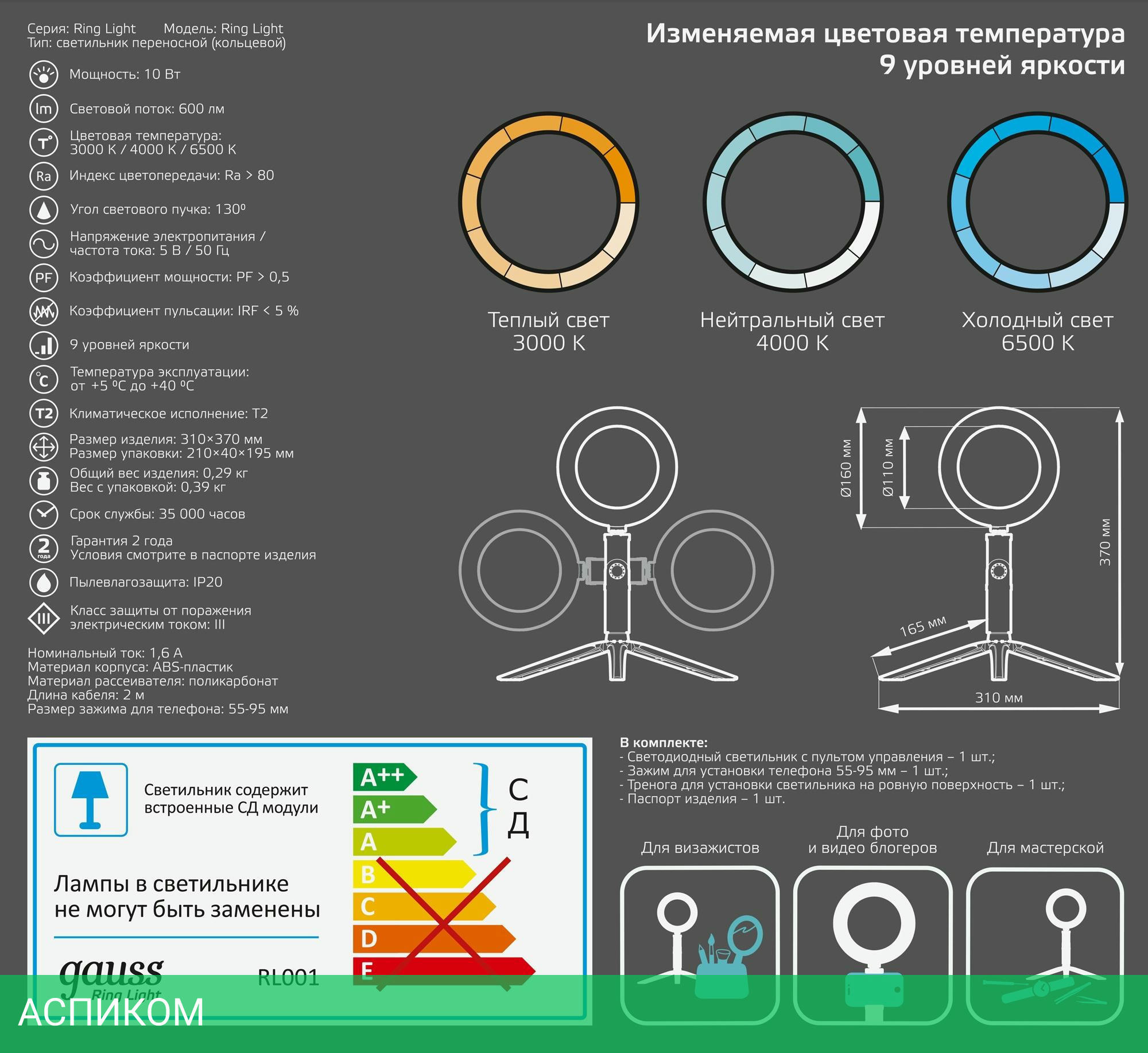 Светильник, зажим для смартфона, тренога, паспорт светильника