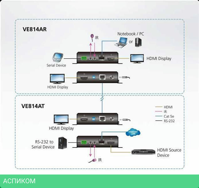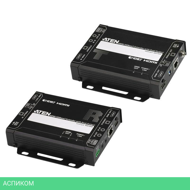 HDMI-передатчик VE814AT, HDMI-приемник VE814AR, кабель ИК-передатчика, кабель ИК-приемника, 2x клеммных разъема RS-232, 2x адаптера питания, руководство пользователя