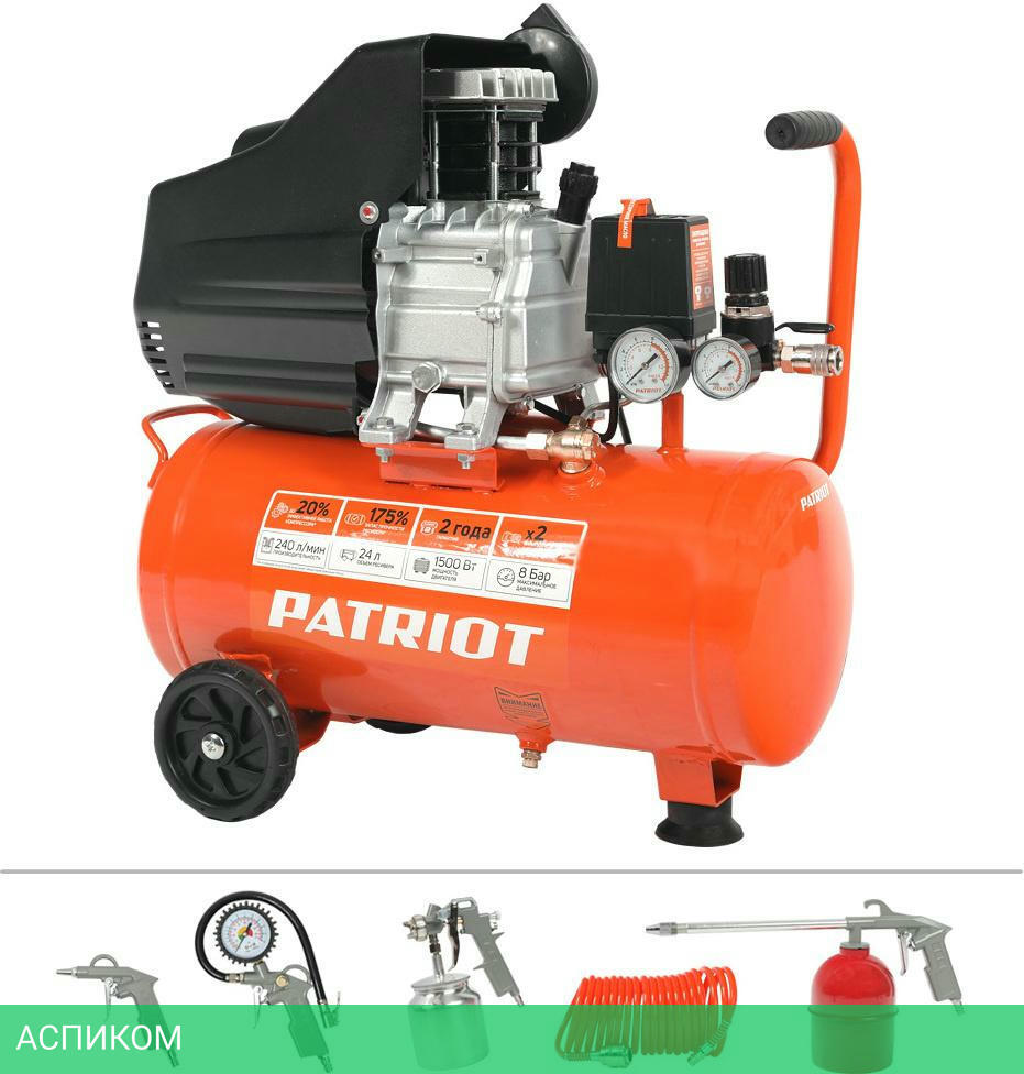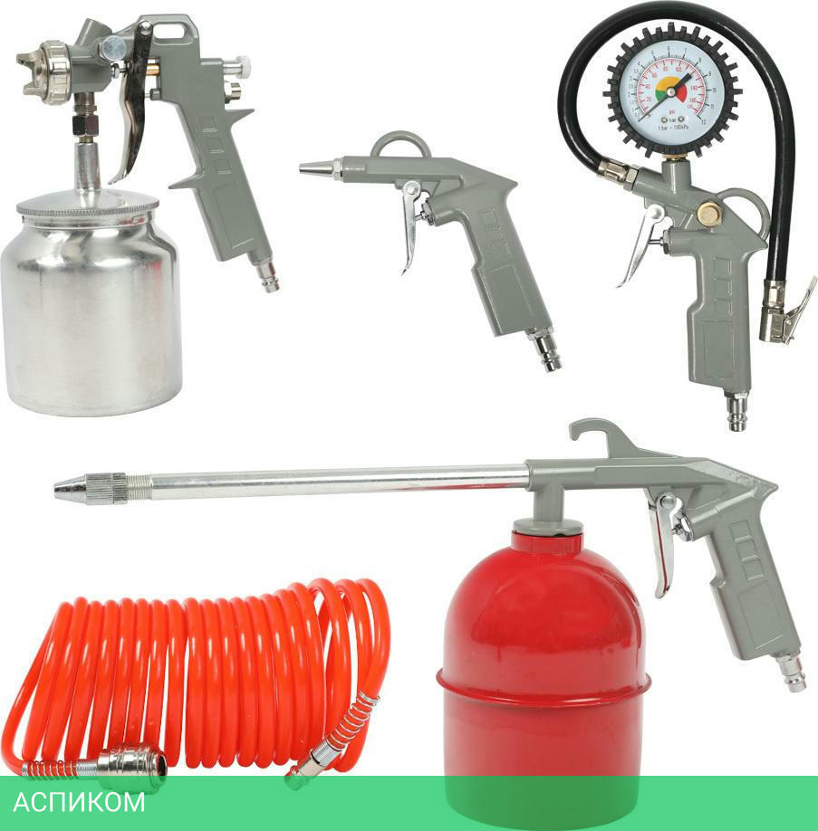 Компрессор, воздушный фильтр, набор пневмоинструмента (шланг, продувочный пистолет, пистолет для накачки шин), комплект колес и амортизатор.