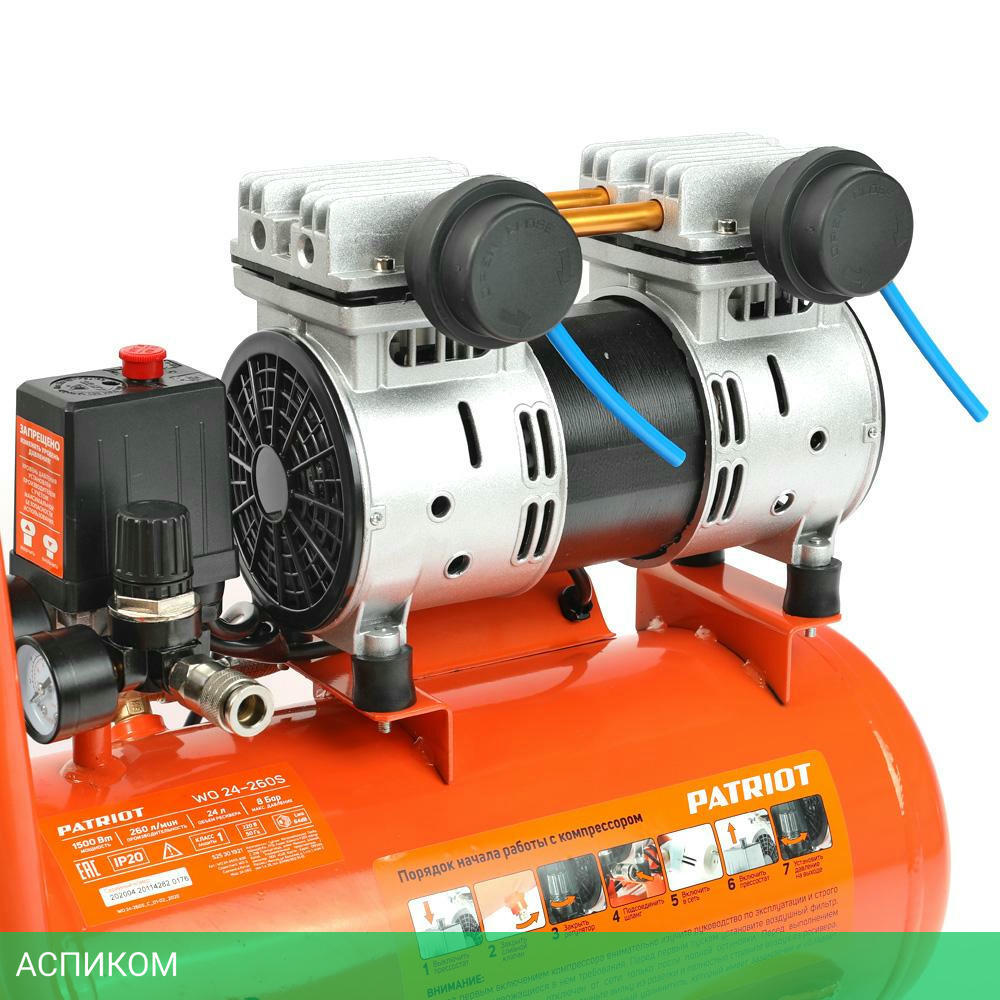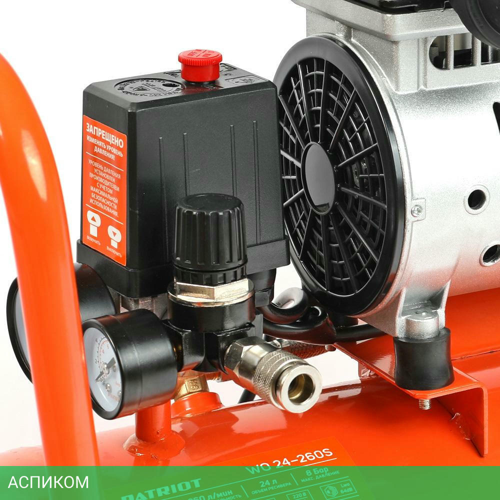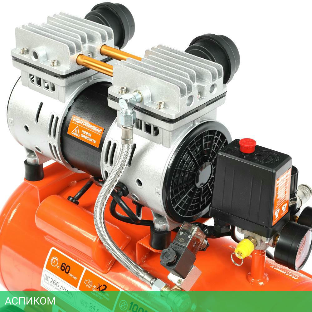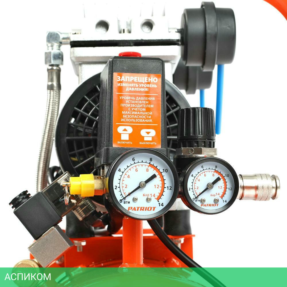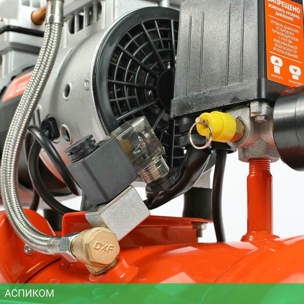 Двигатель оснащен термопредохранителем. Прессостат контролирует включение и выключение подкачки воздуха. Быстросъемный штуцер для удобства. Регулировка и контроль давления в ресивере и на выходе при помощи двух манометров. Набирает давление от 0 до 8 бар за 60 секунд.