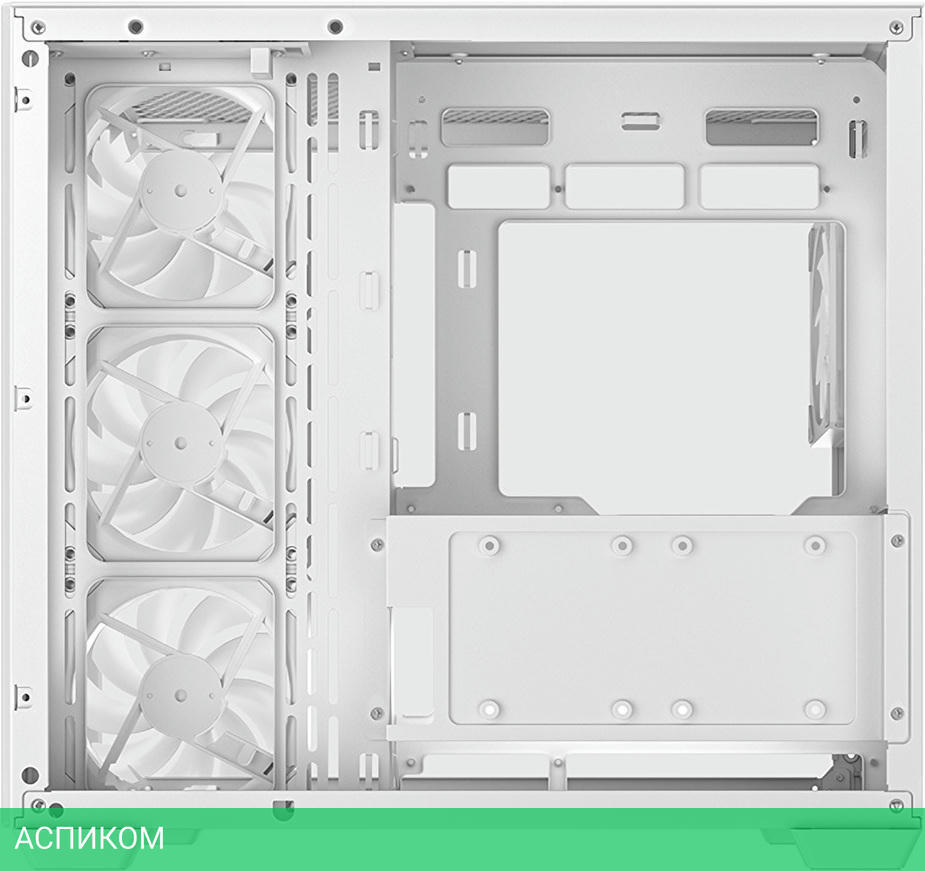 сбоку: 3×120мм(PWM+ARGB Reverse Blade) сзади: 1×120мм(PWM+ARGB)