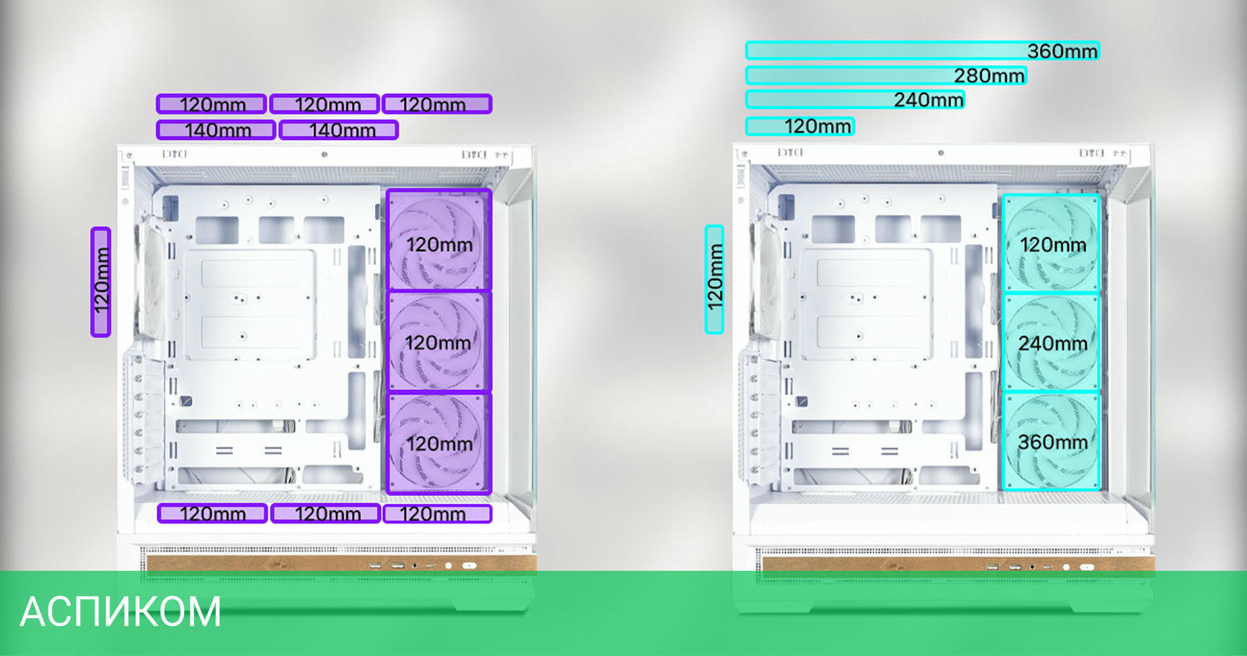 сверху: 3 x 120мм / 2 x 140ммсбоку: 3 x 120ммсзади: 1 x 120ммснизу: 3 x 120ммустановлены:сбоку: 3 x 120ммсзади: 1 x 120мм