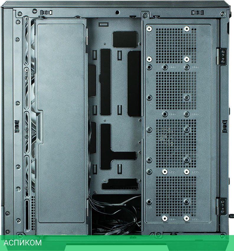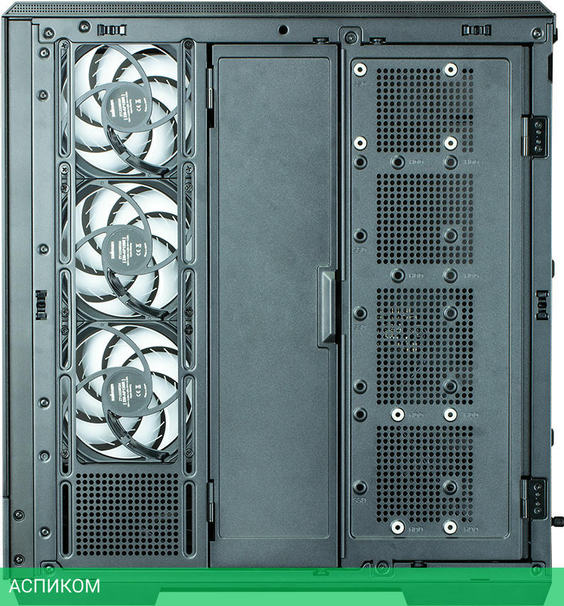 поддерживаемые вентиляторы: верхняя часть — 3 x 120 мм/2 x 140 мм; боковые — 3 x 120 мм (в комплекте); сзади — 1 x 120 мм (в комплекте)/1 x 140 мм; снизу — 3 x 120 мм/2 x 140 мм; поддерживаемые радиаторы: сверху: 120 мм/140 мм/240 мм/280 мм/360 мм; сбоку: 120 мм/240 мм/360 мм; сзади: 120 мм/140 мм