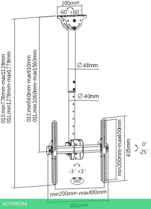 для телевизора / черный / потолочный / 26.0 / 65.0 / 25 / 180.0